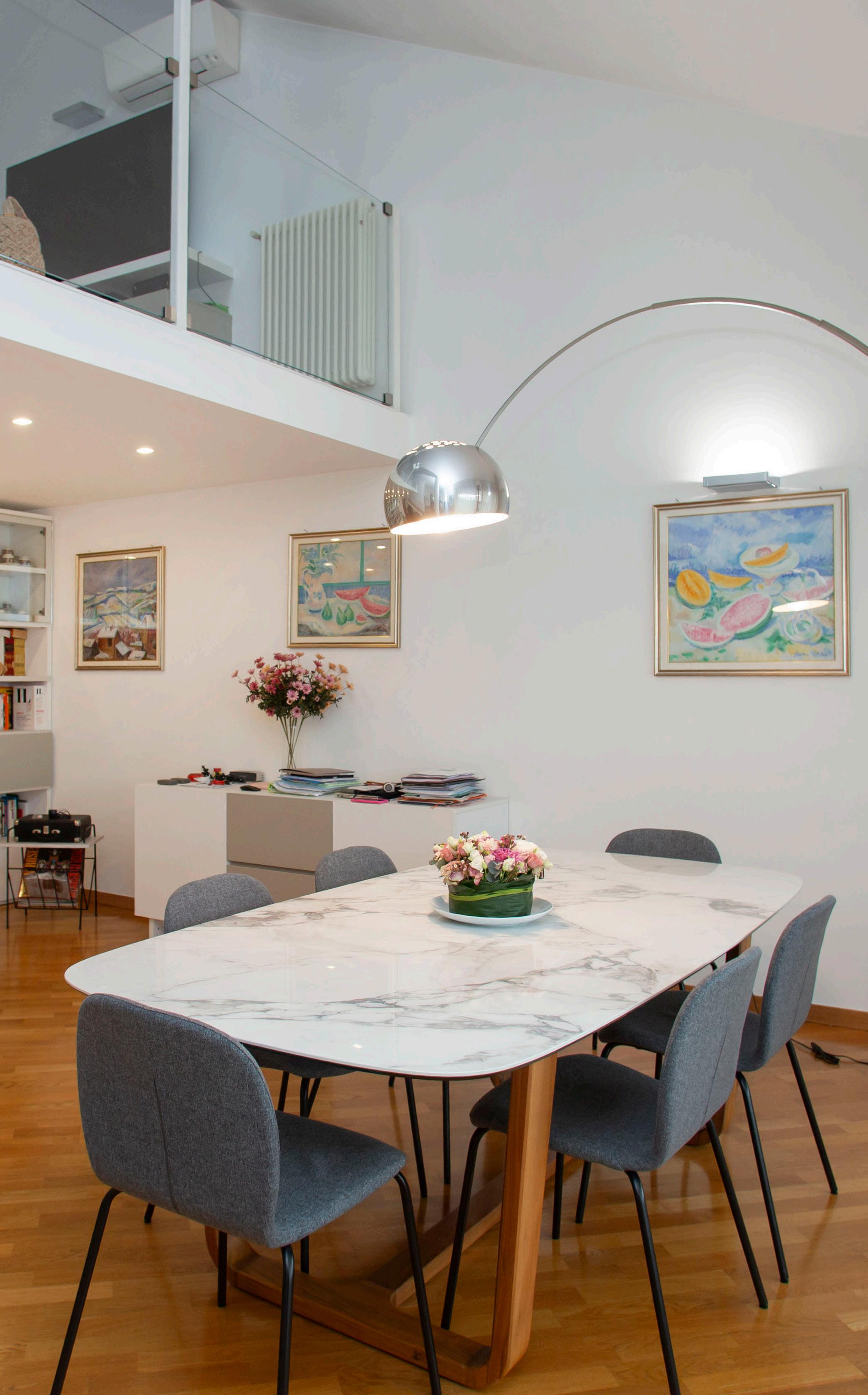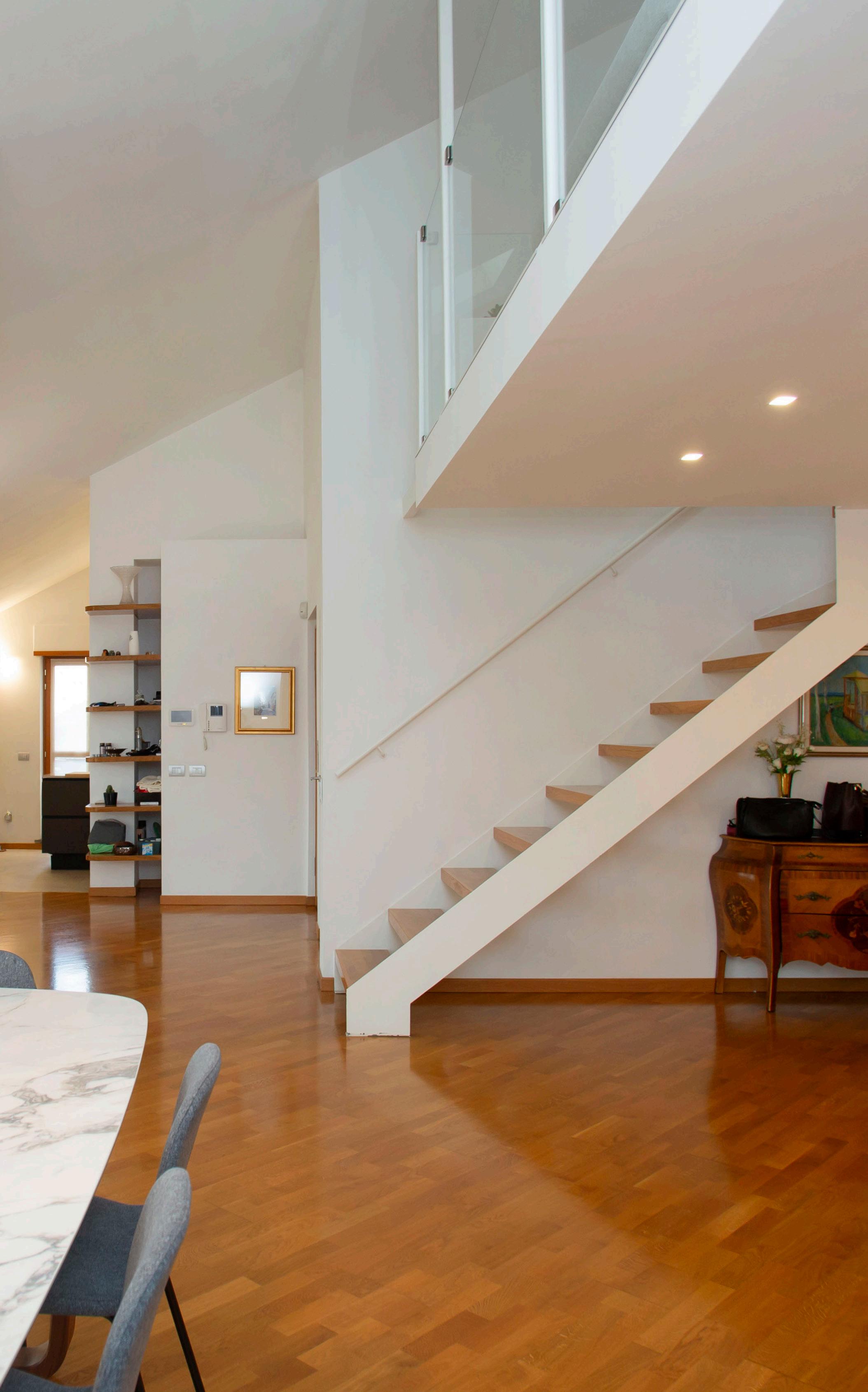 Il secondo livello aggiunge profondità all’abitare: separa i ritmi, crea privacy e rende la distribuzione più completa. La casa si sviluppa su due piani con un’impostazione coerente, pensata per distinguere la parte più vissuta e rappresentativa dalle zone più riservate. È una scelta che alza la qualità quotidiana: si ospita senza invadere, si vive senza sovrapporsi, si ritrova silenzio quando serve. Un attico su due livelli non è solo metratura: è una gerarchia degli spazi fatta bene.