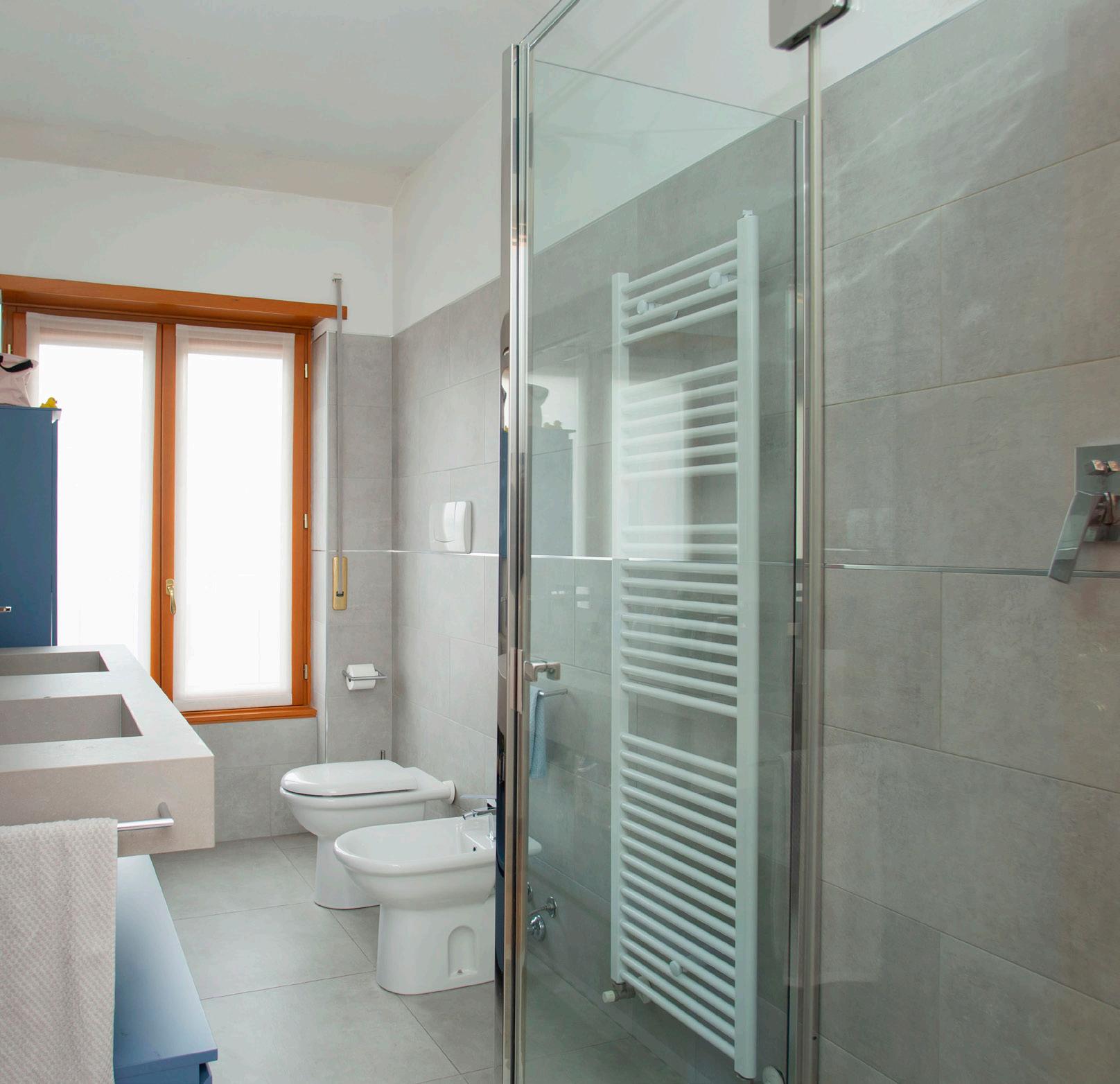 BAGNO lavabo ampio, rivestimenti materici e doccia con box trasparente