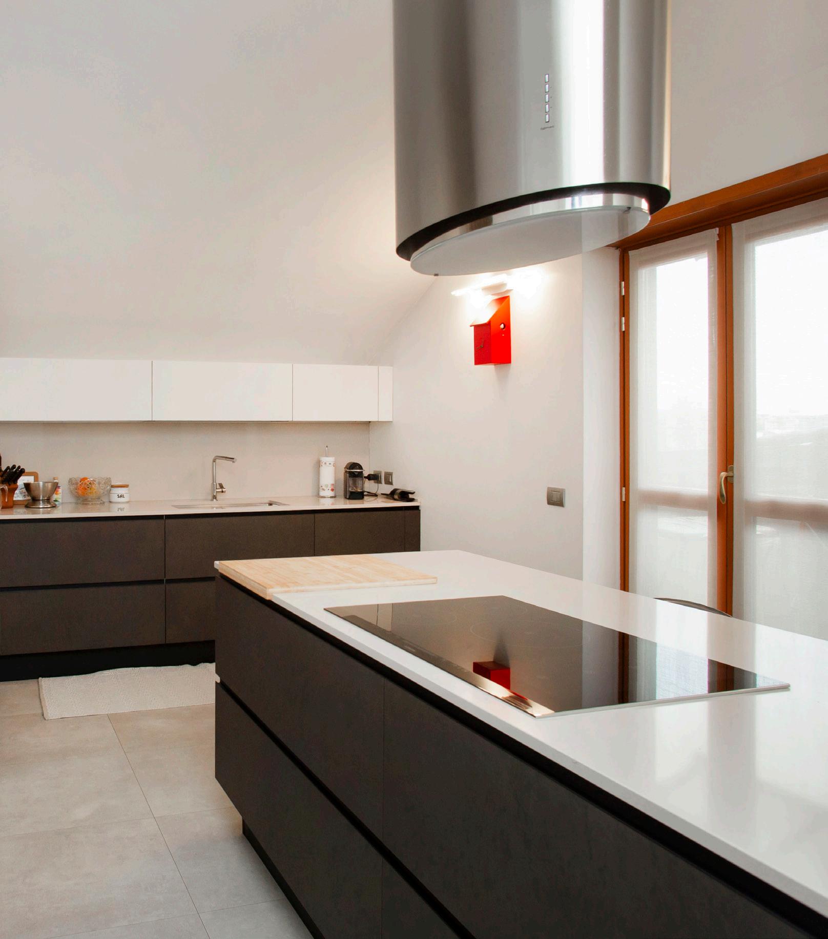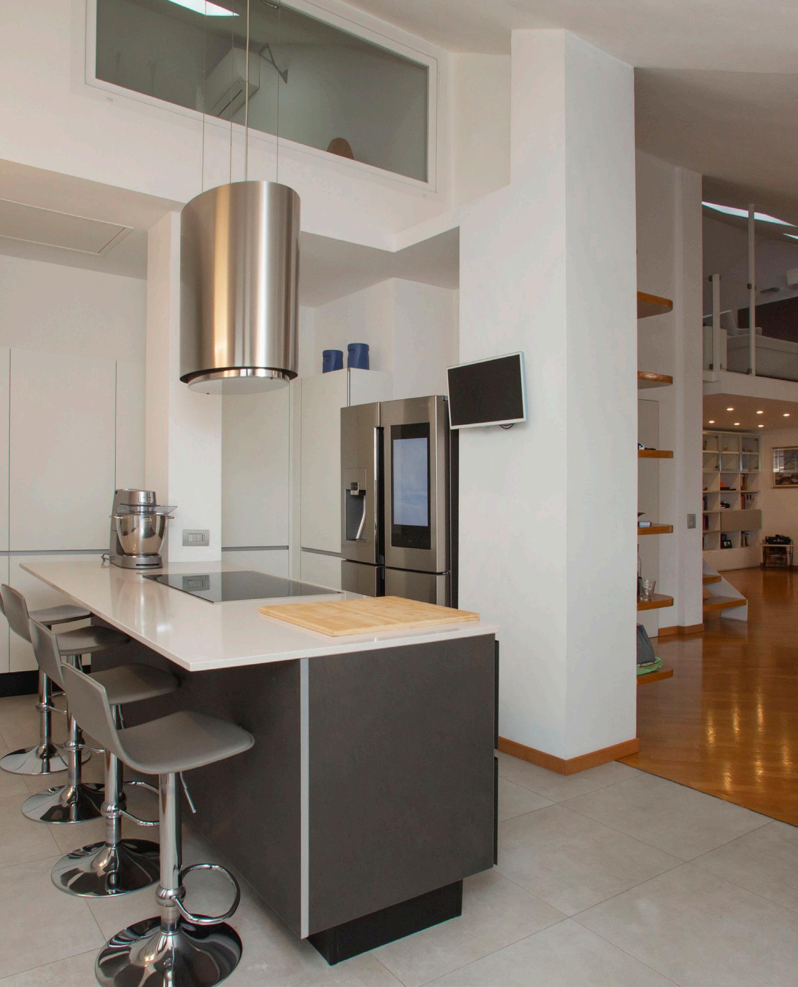 La cucina è abitabile, spaziosa e perfettamente organizzata: il vero cuore operativo della residenza. È un ambiente pensato per chi cucina e vive la casa con continuità, ma anche per chi desidera un luogo raffinato dove condividere: colazioni lente, pranzi di famiglia, cene informali che diventano rituali. Qui la qualità non è solo estetica: è nella funzionalità, nella gestione dei flussi, nella sensazione di ordine che resta anche a fine giornata. Una cucina che sostiene lo stile dell’attico senza ostentarlo.