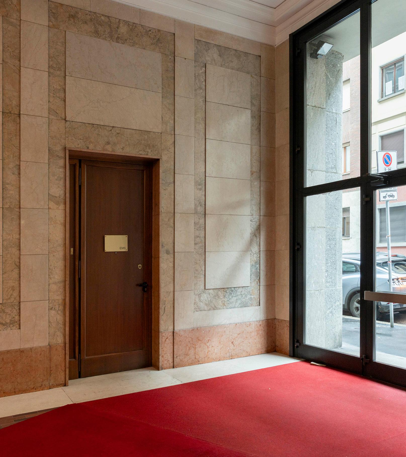 INGRESSO atrio d’ingresso dello stabile con finiture in pietra e accesso vetrato, coerente con un contesto signorile e rappresentativo