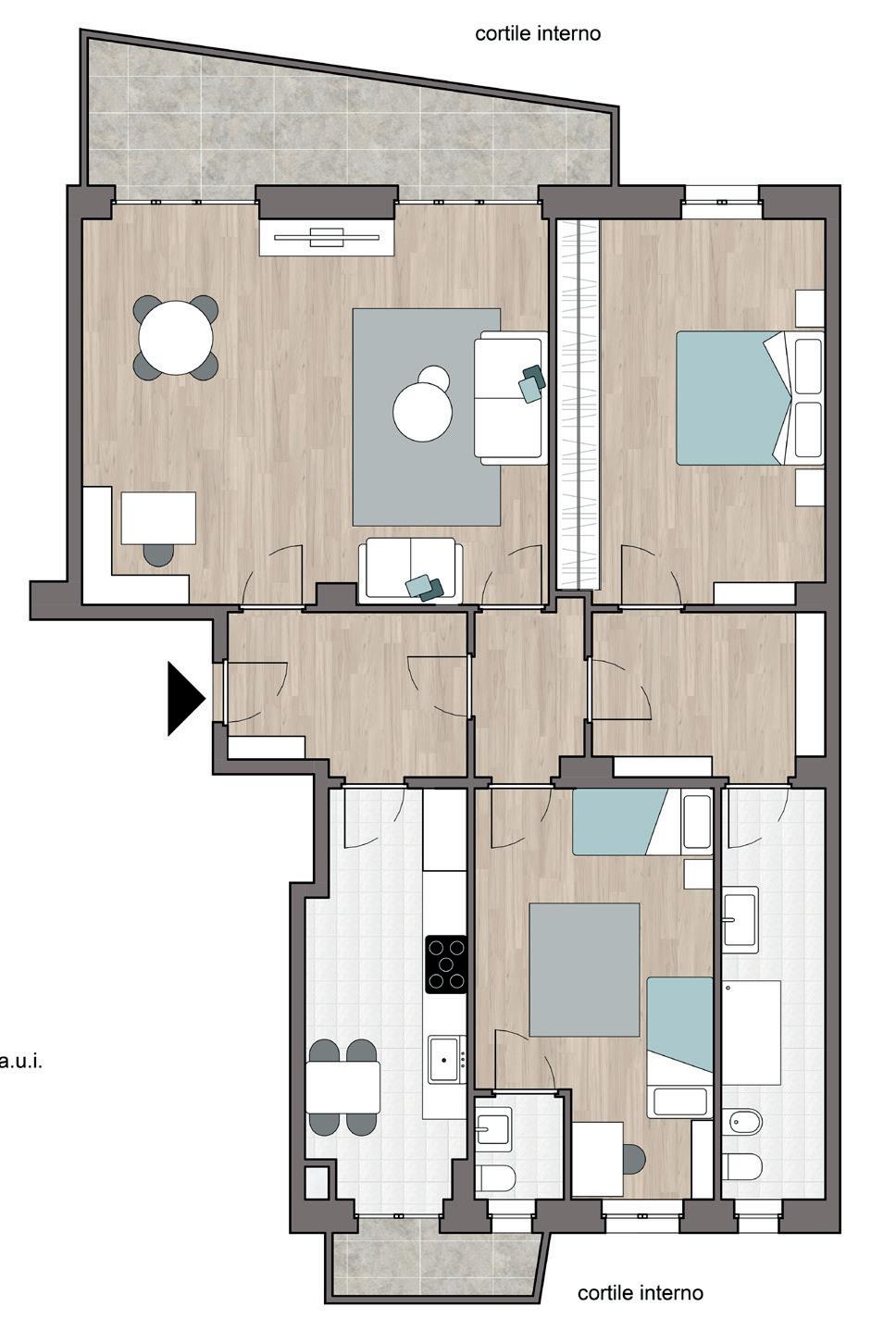 L’appartamento affaccia con i suoi balconi esclusivamente sul cortile interno garantendo privacy e un riposo tranquillo in pieno centro città. La doppia esposizione garantisce un ottima luminosità in tutti gli ambienti.