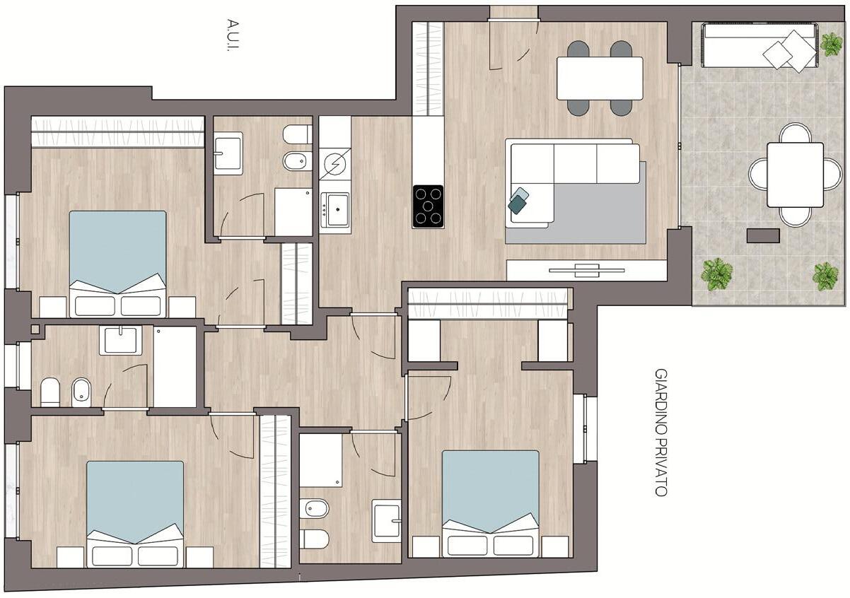 Il trilocale si troverà al piano terra e godrà di un bellissimo giardino privato per le pause dedicate al proprio benessere, adatto anche per ricevere ospiti. Presentano tutti un ampio soggiorno con cucina a vista e affaccio sul giardino, un disimpegno, la camera da letto matrimoniale, la cameretta e due bagni finestrati.