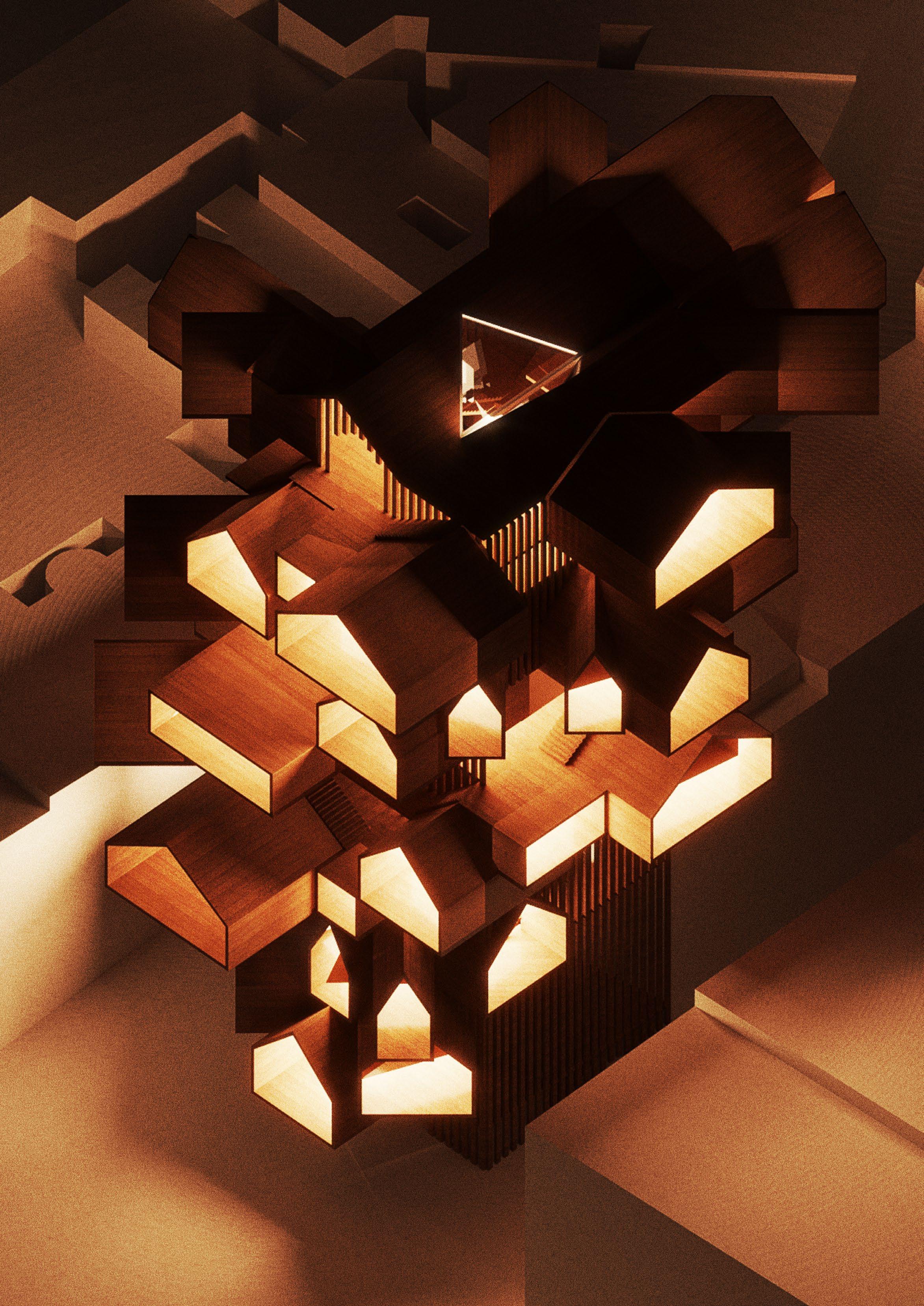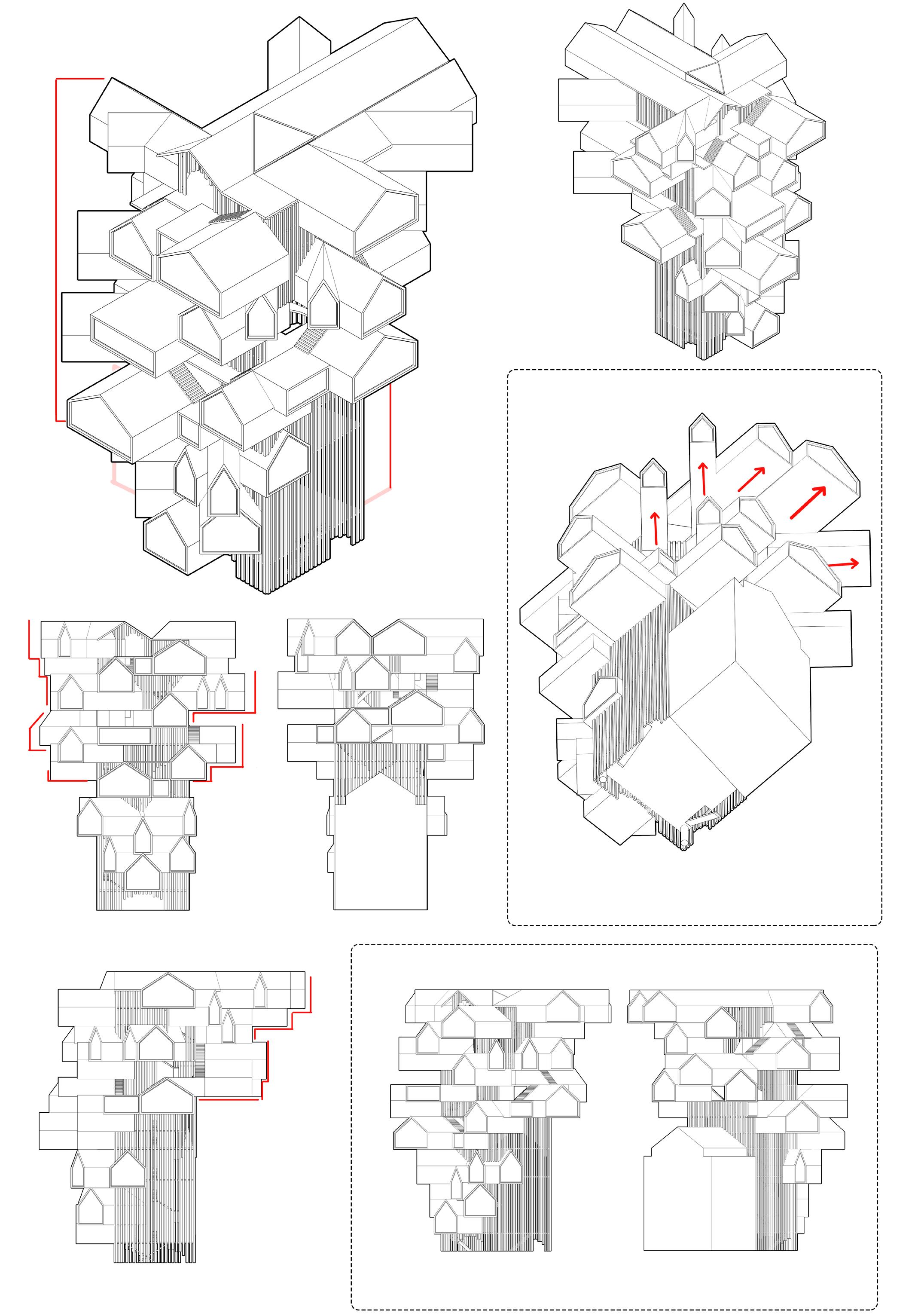 La forma general del proyecto nace de la búsqueda por satisfacer la demanda energética aprovechando la orientación de las parcelas además de intentar convertir la cubierta en la extensión del espacio público, esto se ve complementado por el planteamiento diafano del basamento, mediante el cual se permite que el proyecto sea atravesado.