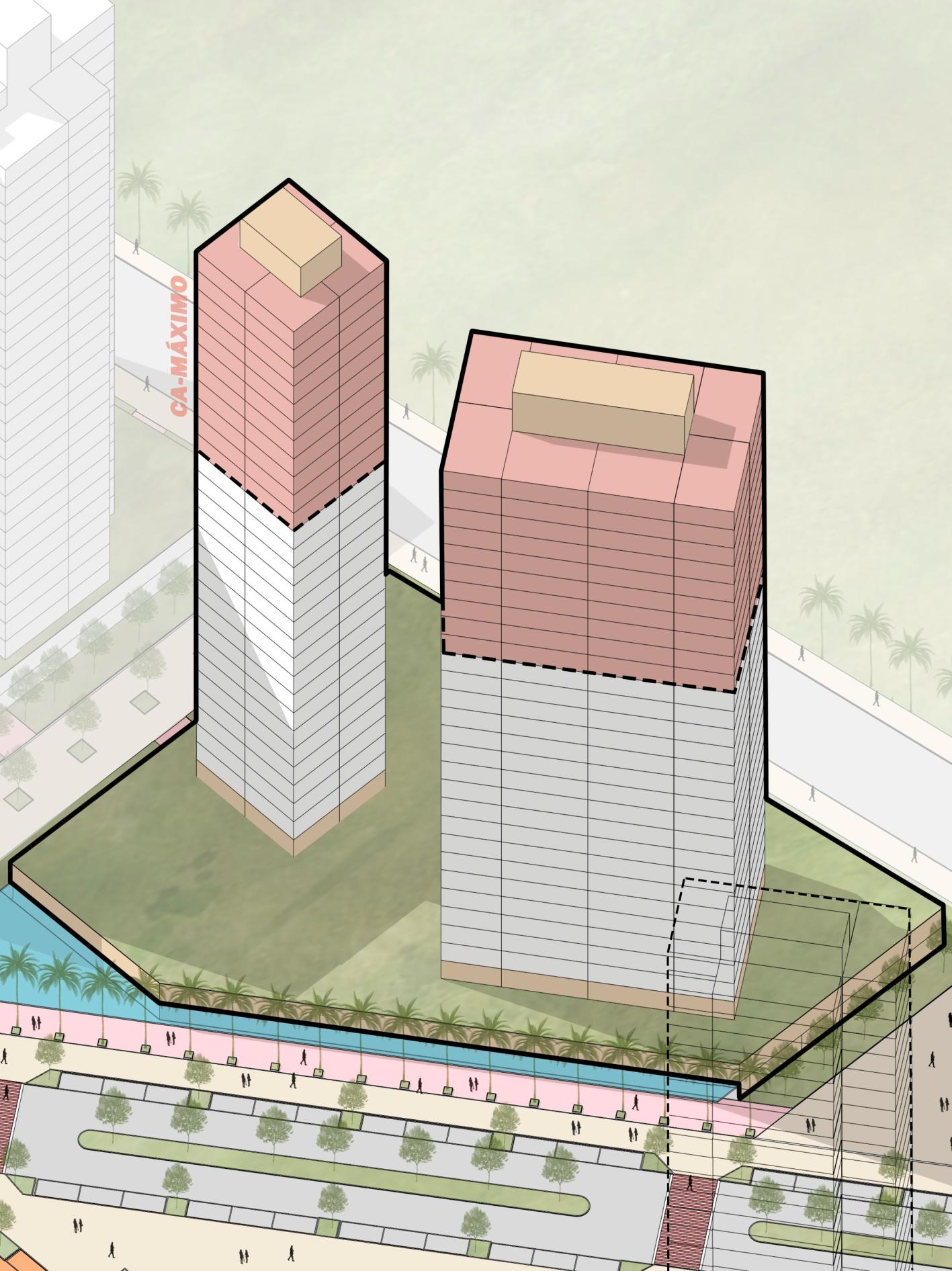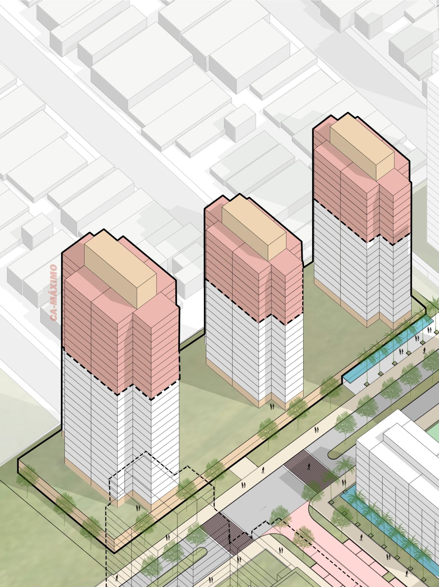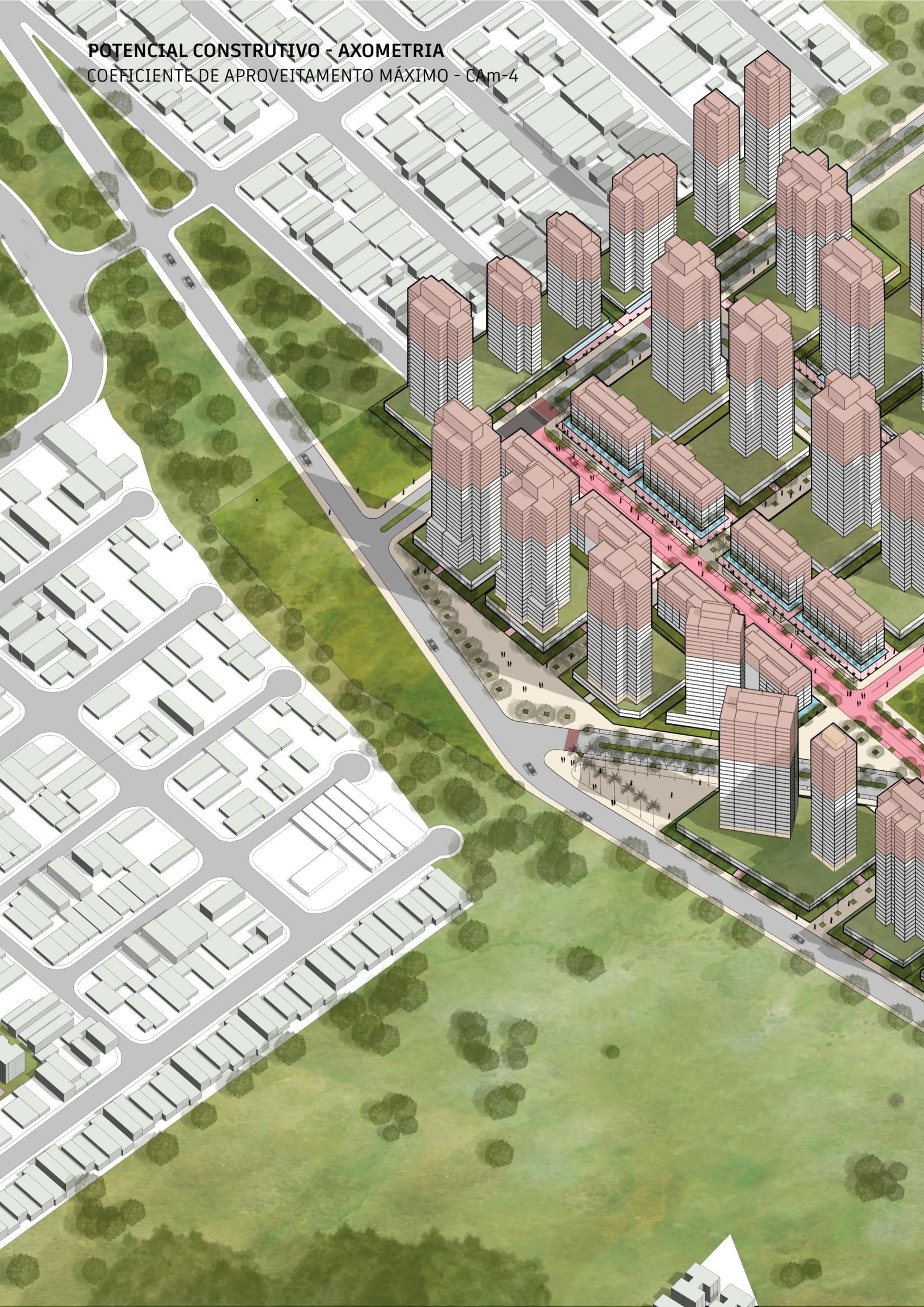 Já na modelagem com o Coeficiente de Aproveitamento Máximo (4,0), podemos observar uma significativa ordem de grandeza nos usos previstos, tendo mais de 750 mil m² (setecentos e cinquenta mil metrosquadrados)deáreaconstruída,sendomaisde4.500(quatromilequinhentas)unidadeshabitacionais e mais de 2.100 (dois mil e cem) unidades de serviços; no entanto, esta modelagem demanda o pagamento de OutorgaOnerosaprevistonaLeideUsoOcupaçãoeParcelamentodoSolo-LCn°340/2019 Este Masterplan chegou a duas modelagens de capacidade construtiva: a primeira explorando apenas o Coeficiente de Aproveitamento Básico (2,5), totalizando quase 500 mil m² (quinhentos mil metros quadrados)deáreaconstruídaentreosdiversosusospropostos(habitação,comércioeserviços),chegandoa até 3.000 (três mil) unidades habitacionais e mais de 1.300 (mil e trezentos) unidades de serviços (comércio e salascomerciais).