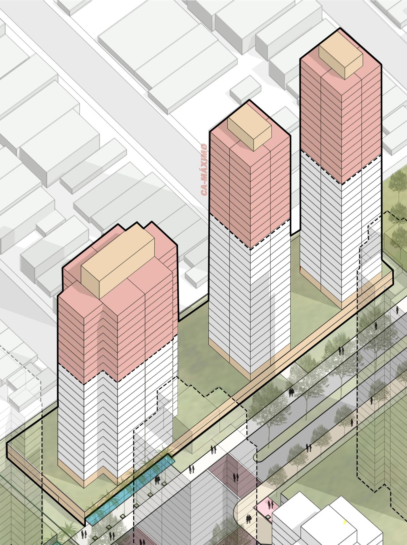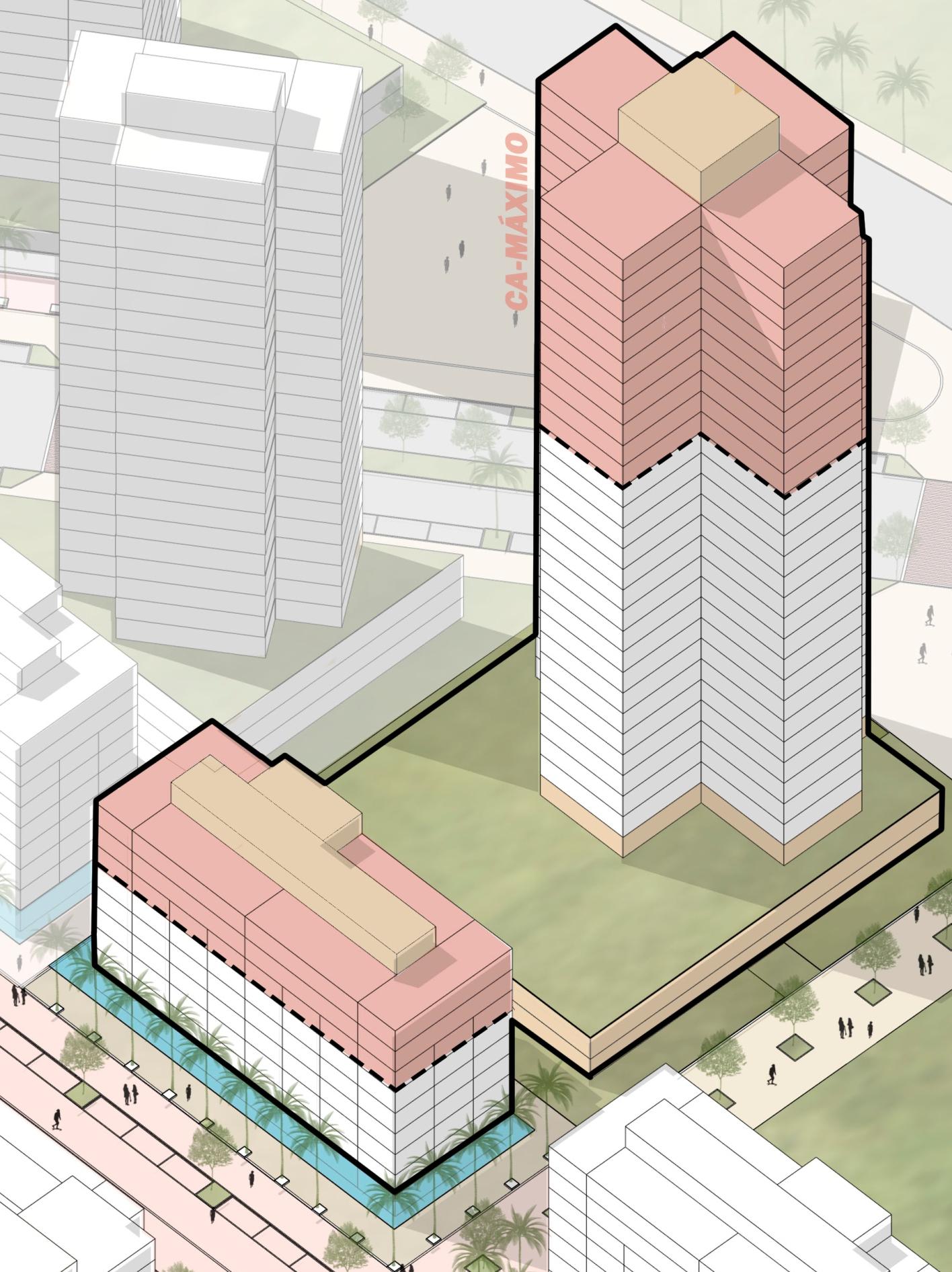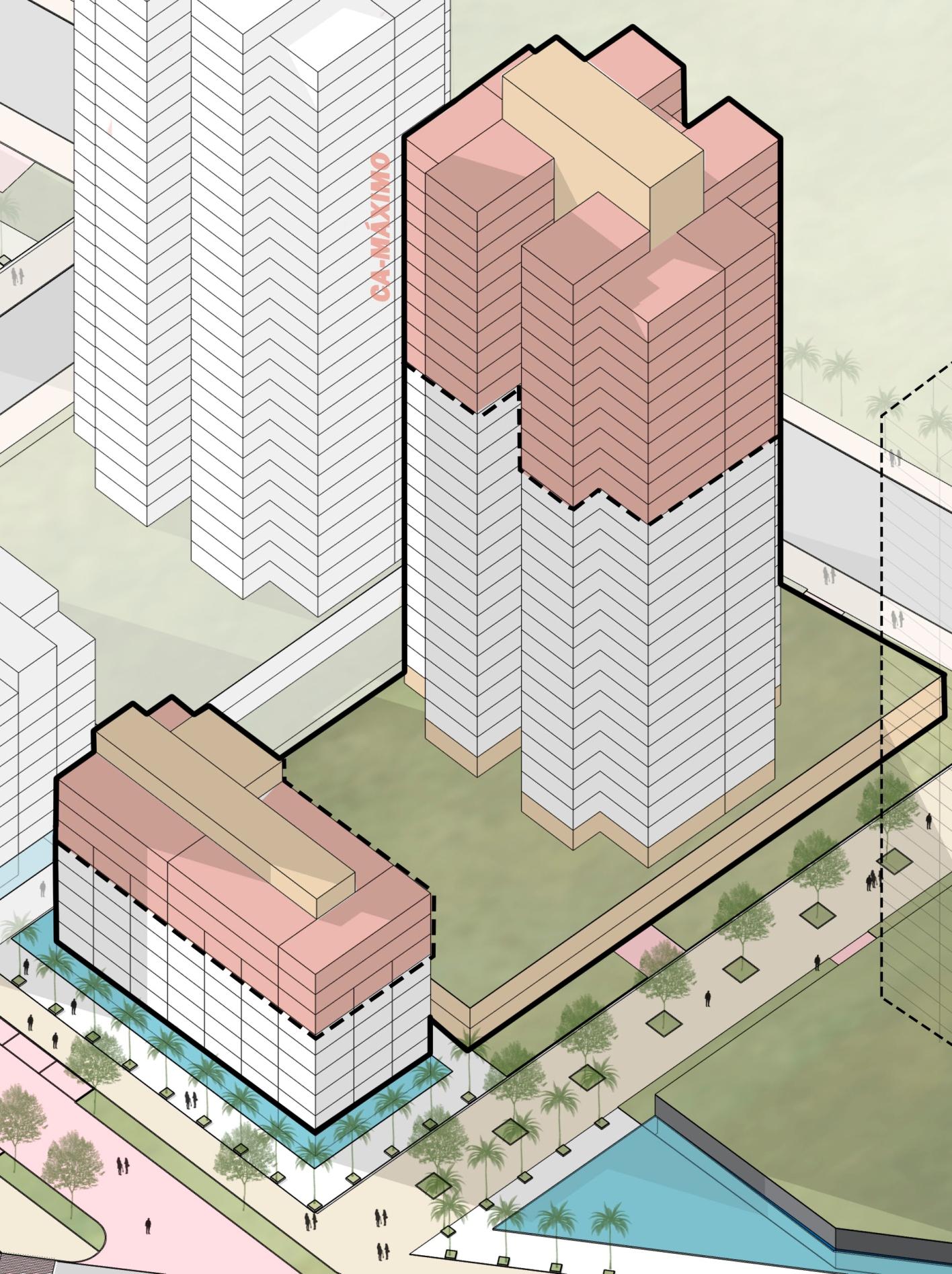 Já na modelagem com o Coeficiente de Aproveitamento Máximo (4,0), podemos observar uma significativa ordem de grandeza nos usos previstos, tendo mais de 750 mil m² (setecentos e cinquenta mil metrosquadrados)deáreaconstruída,sendomaisde4.500(quatromilequinhentas)unidadeshabitacionais e mais de 2.100 (dois mil e cem) unidades de serviços; no entanto, esta modelagem demanda o pagamento de OutorgaOnerosaprevistonaLeideUsoOcupaçãoeParcelamentodoSolo-LCn°340/2019 Este Masterplan chegou a duas modelagens de capacidade construtiva: a primeira explorando apenas o Coeficiente de Aproveitamento Básico (2,5), totalizando quase 500 mil m² (quinhentos mil metros quadrados)deáreaconstruídaentreosdiversosusospropostos(habitação,comércioeserviços),chegandoa até 3.000 (três mil) unidades habitacionais e mais de 1.300 (mil e trezentos) unidades de serviços (comércio e salascomerciais).