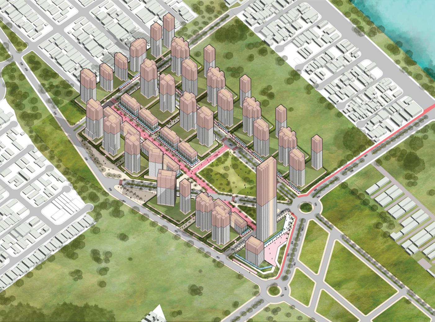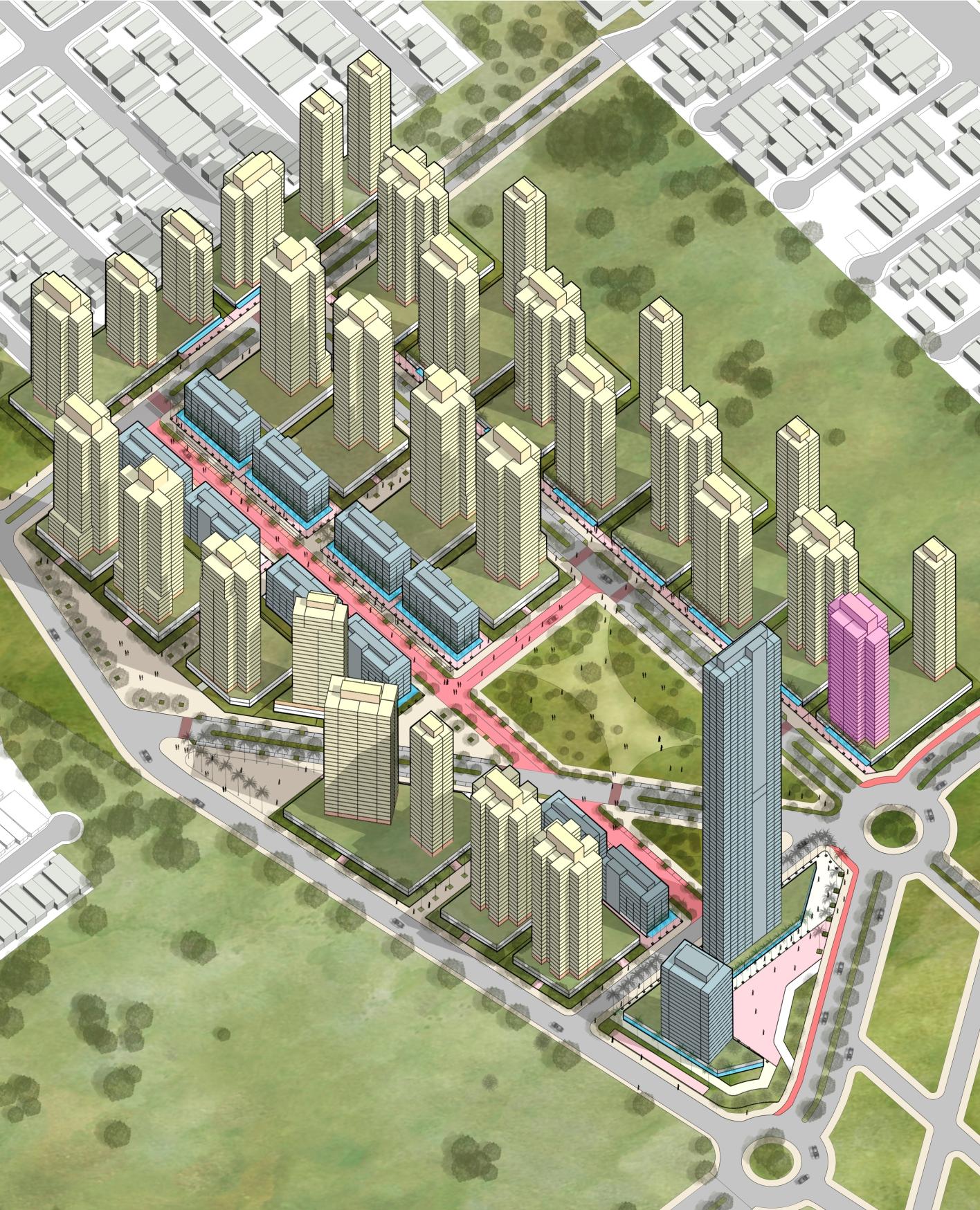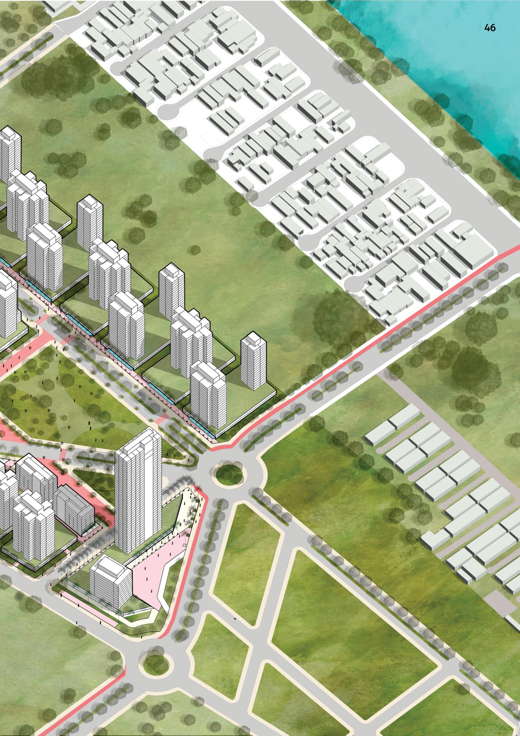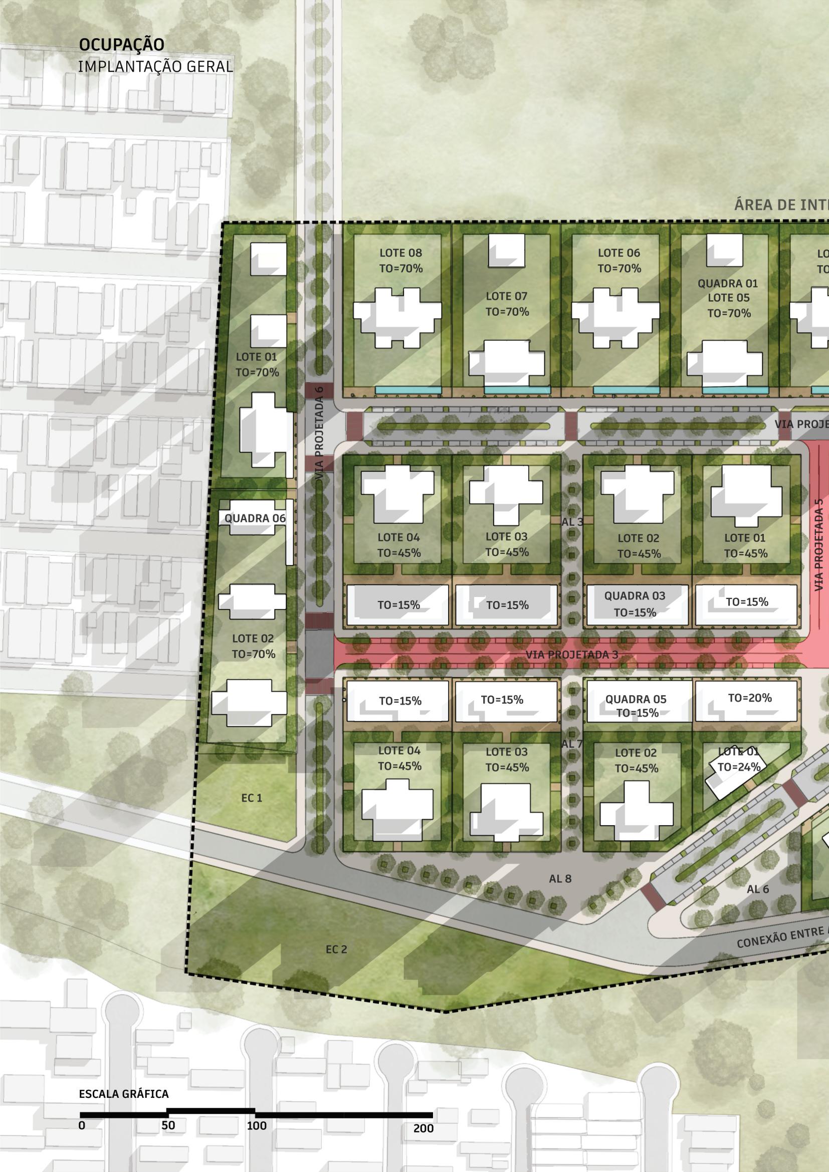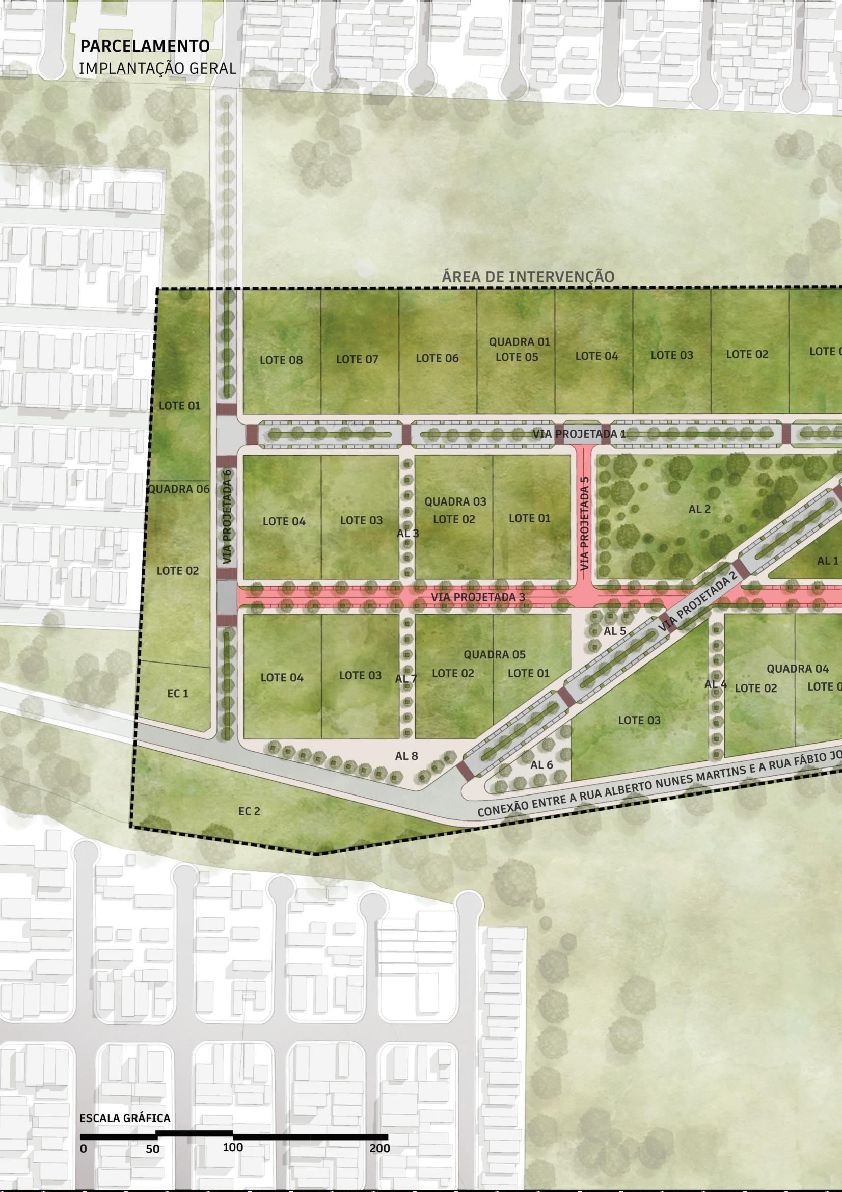 Já o parcelamento foi proposto de forma a garantir uma ocupação diversificada e com a composiçãodeespaçosintegrados,oracomasquadrasvoltadasparaduasgrandesáreasverdes(pocket parks),oraparaáreaslivresdestinadosainteraçãosocialepassagensentreosdemaisespaçosdobairro.