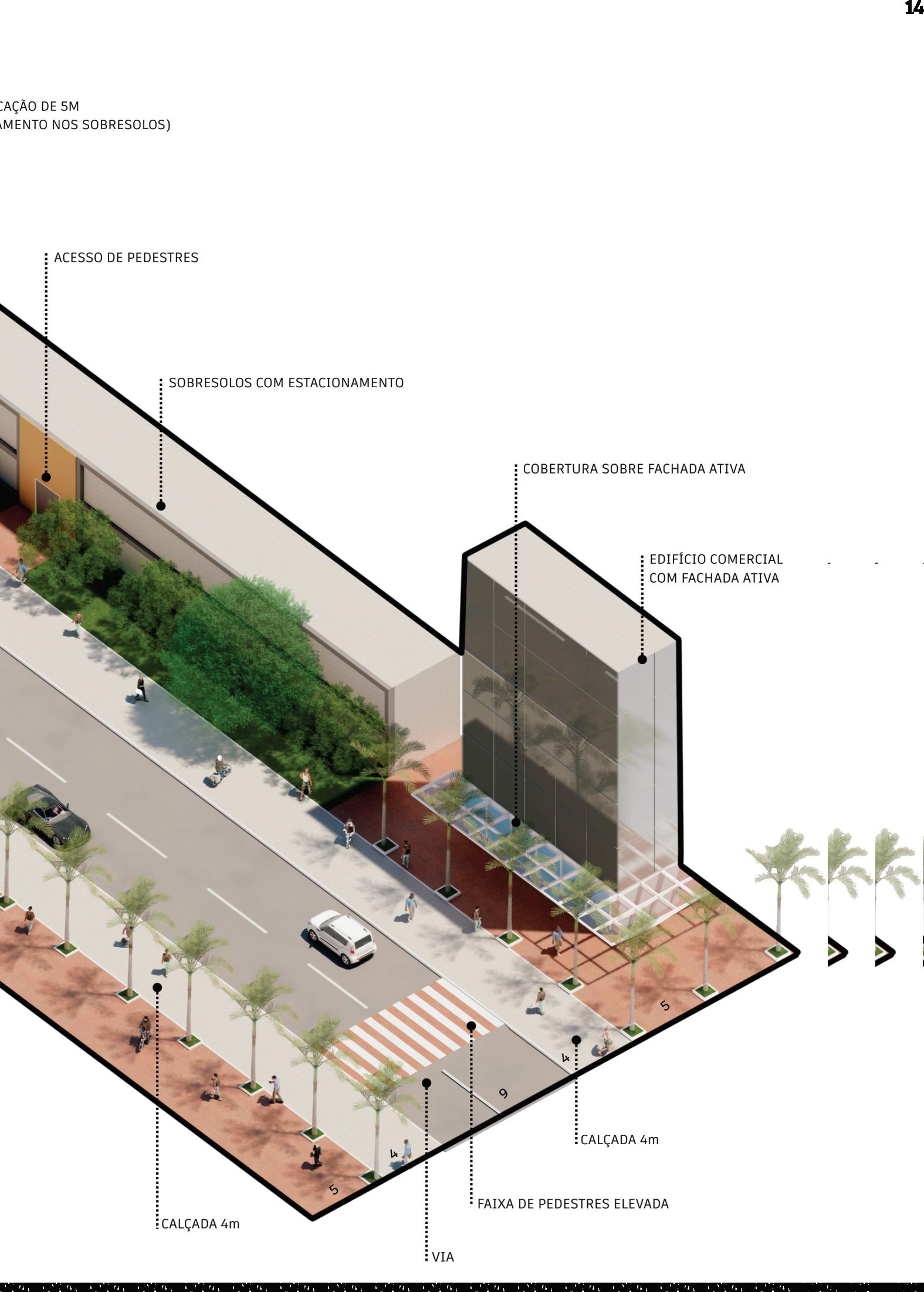 As habitações “dividem a cena” com as demais atividades nas demais quadras, mas numa sinergia com a dinâmica deste bairro, ampliando consideravelmente a qualidade urbanística deste território; Enquanto a Quadra 01, o lote 3 da quadra 4 e a quadra 06 são dedicadas exclusivamente as diversas tipologias habitacionais, com variação de um dormitório (estúdios) à três dormitórios, ainda sim, com a presença de fachadas ativas no térreo como elemento articulador da dinâmica urbana, as Quadras 03 e 05 são fortalecidas compequenos centros comerciaisjunto a Rua Compartilhada, ampliando ousonesteeixo e sua vida durante24 horas no bairro, com a presença de comércio (fachada ativa), serviços (pequenos escritórios) e habitação de pequenoemédioporte(estúdiosedoisdormitórios).