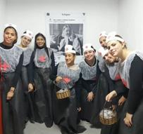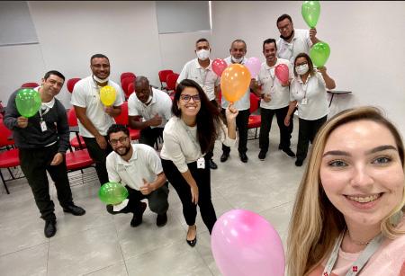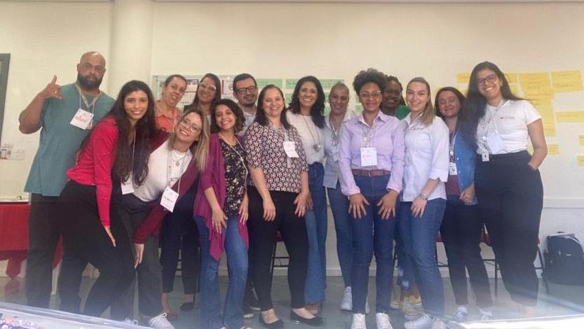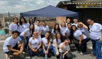 Alunos do curso de Cuidador de Idosos, juntos à professora Roselaine Cristina, na ação de arrecadação de fraldas geriátricas.