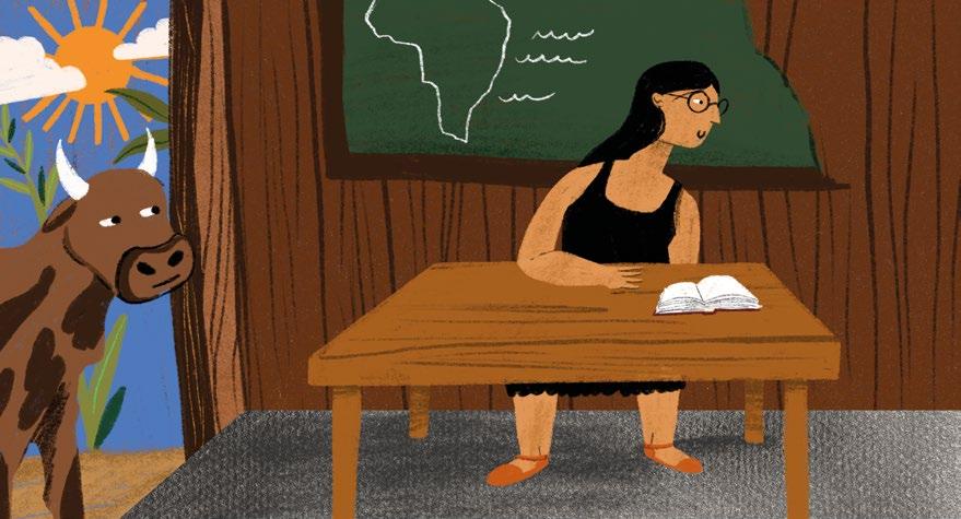 Página 13: “Aparecida dava aulas em uma classe multisseriada: na mesma sala ficavam alunos de anos escolares diferentes e de idades variadas. Isso foi no tempo em que não havia muitos professores na cidade e não se podia organizar as turmas como se deve. A mesa feita a facão era alta e não atendia às crianças menores. Nos dois únicos bancos de tábuas sentavam-se até dez alunos. A lousa era só um pedaço, porque tinha chovido e estragado o restante.”