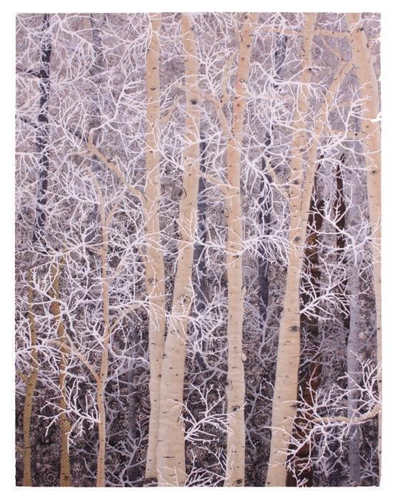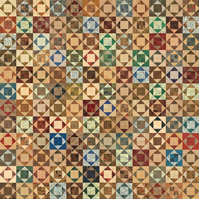 when needed. To save time, I'll use the laser cutter at the University of Maine to carve hardcover books into the ‘tiles’ that I need for the piece—all other elements are hand cut. Those tiles are painstakingly applied to quarter-inch Komatex panels [rigid PVC sheets], then coated with satin varnish to prevent fading.” The entire process takes about 160 hours and results in a 48 x 48-inch finished work. His approach to choosing materials recalls how a textile artist gathers fabrics for a piece, whether it be a scrap quilt or a modern abstract. “The books I select have to be a good match for the piece I've created in my mind—not unlike quilters looking for just the right pattern and colors in the fabrics they choose. I attempt to use every part of those books—the covers, the pages, the spines—so nothing goes to waste.”