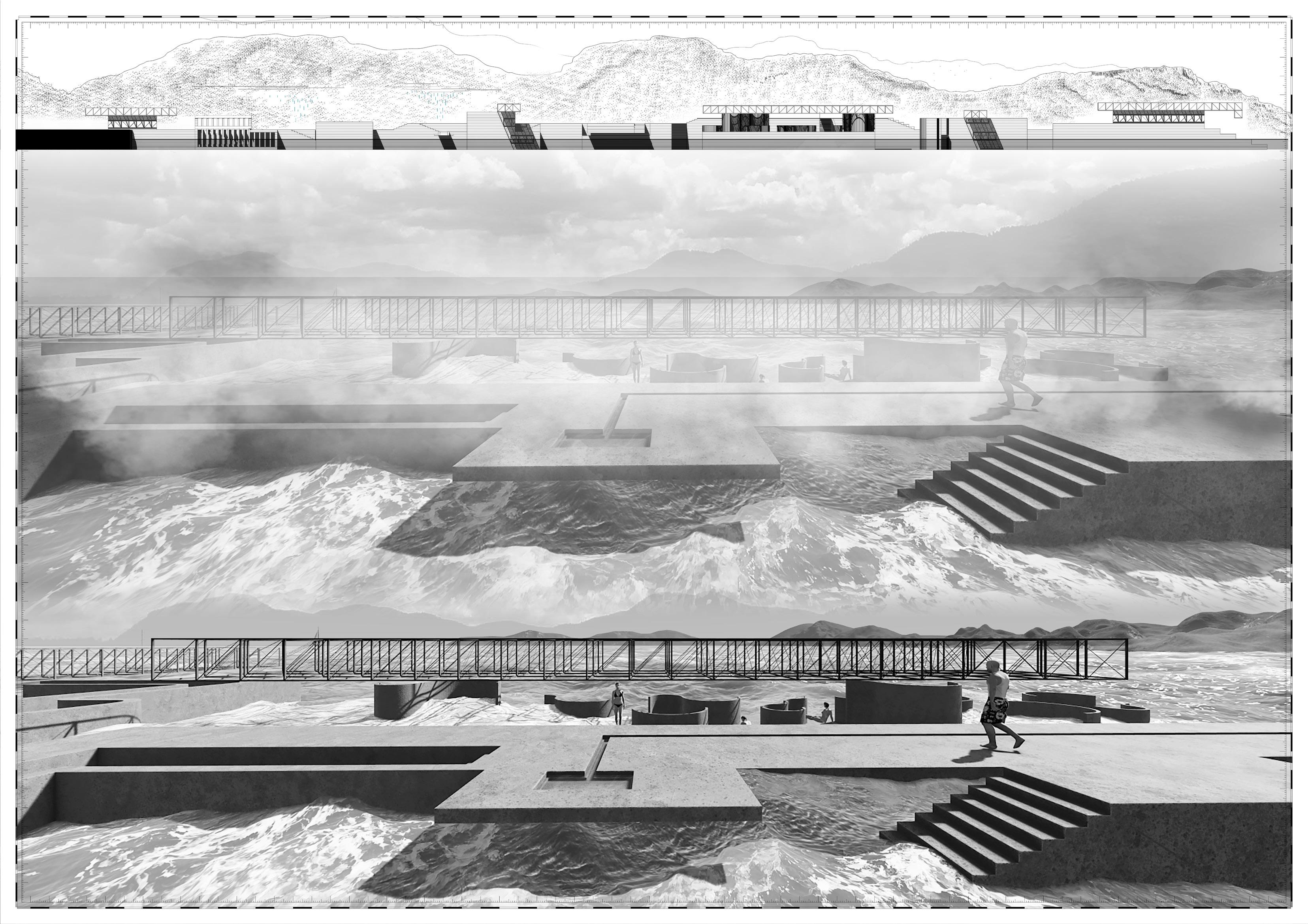 Se proyecta a modo de narrativa cinematográfica, crando espacios lúdicos y baños termales heterogéneos que acojan todas las particularidades del paisaje. Se trata de trasladar los agentes que transforman la costa de Vigo a cada escena del espigón. Tales como la niebla, la erosión, la calma del mar, el oleaje... La bajamar y la pleamar activan y desactivan los programas. Dichos eventos pretenden recuperar la identidad de Vigo.