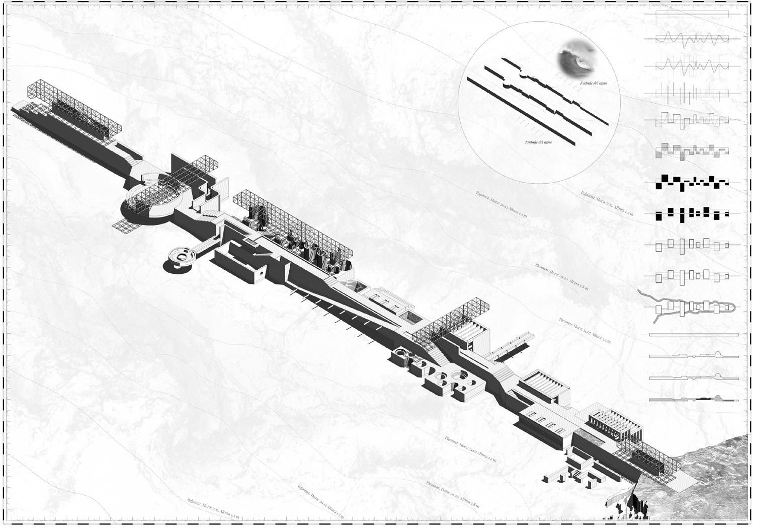 Intangible scale: the cosmos. The tides are produced by the gravitational action of the moon and the sun on the earth. Therefore, time and water form the guiding thread of the entire architecture.