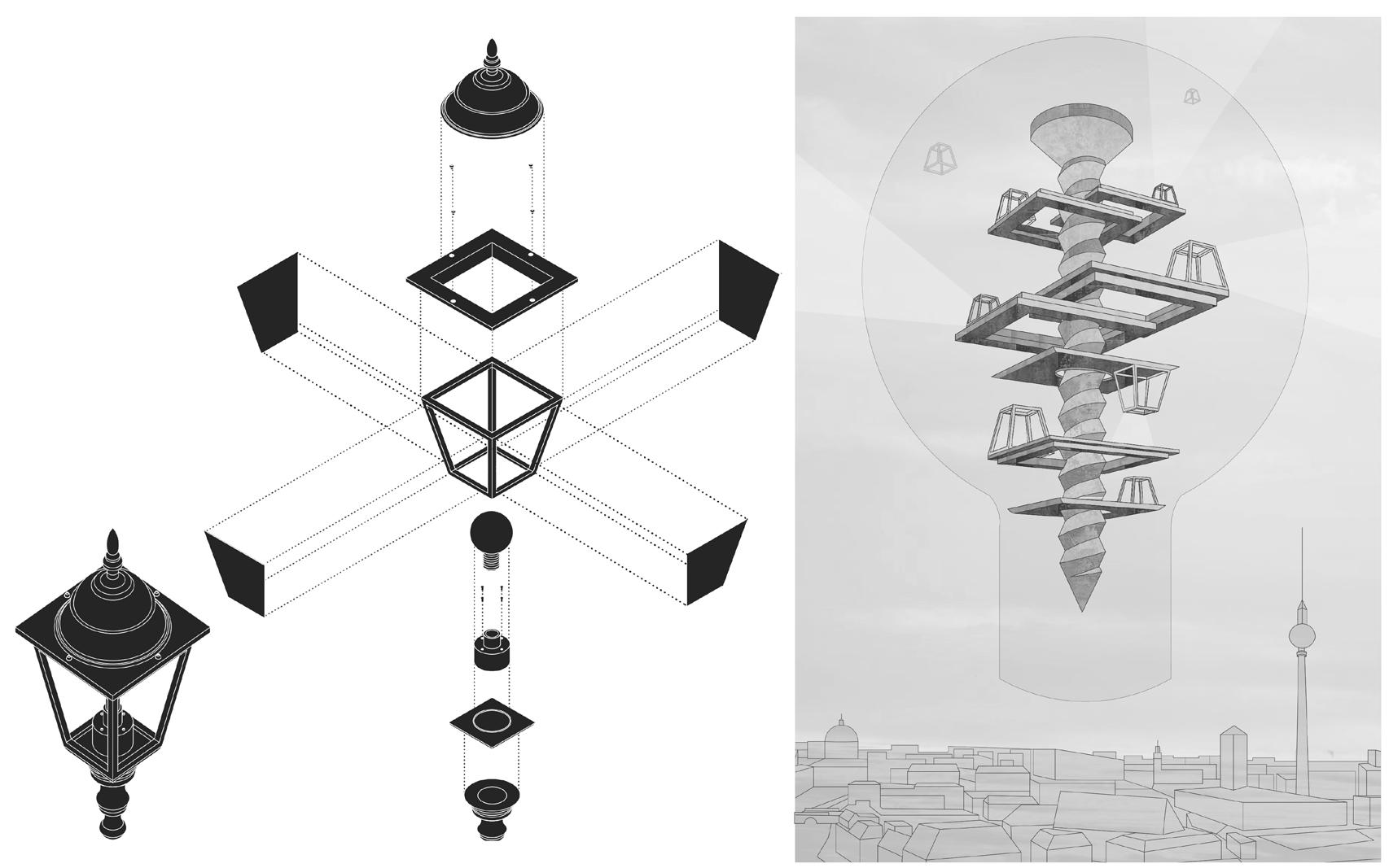 The trays moving towards and away from the screw look for the best views of Berlin, the place where this lantern is located.