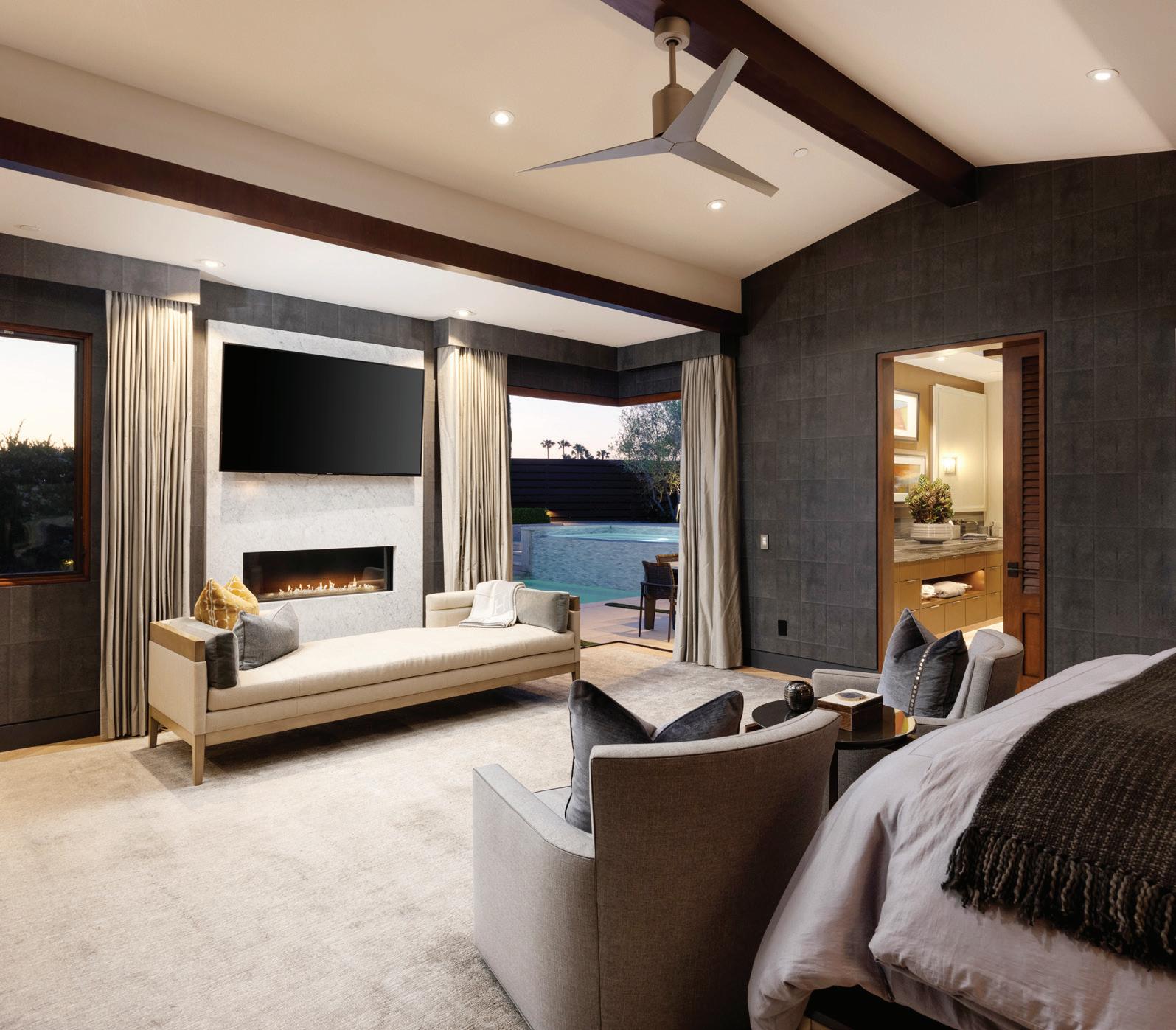 The main level primary suite encompasses an entire wing of the home, starting with an executive o ce. Just beyond is the spacious primary bedroom with replace, additional seating and private access to the pool and spa is discovered. Dual vanities, custom cabinetry, a stone & glass shower, and tub thoughtfully detail this tranquil space. A perfect nale to the primary suite is a closet featuring a center island with dual-sided drawers and enclosed wardrobes.