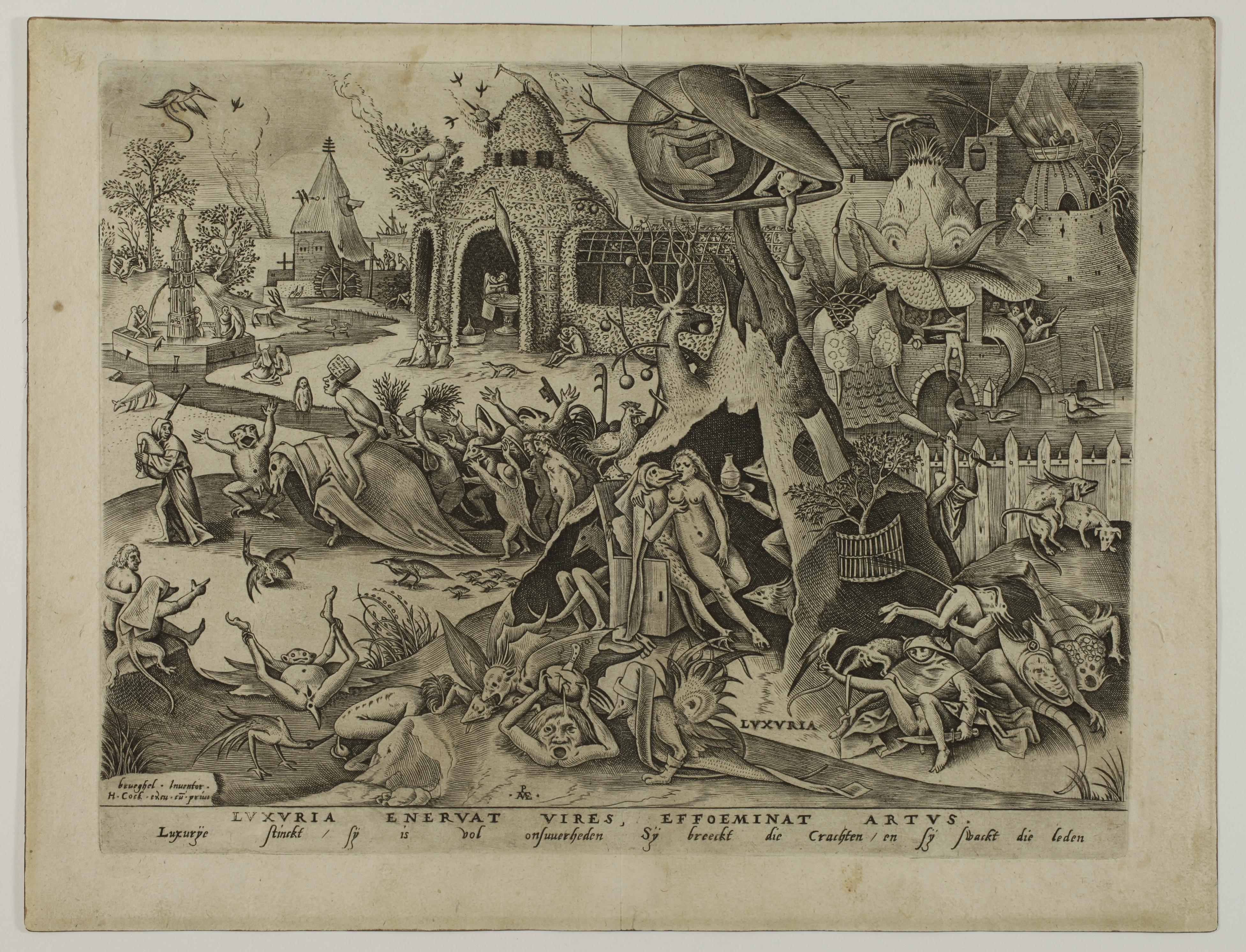 La légende latine LUXURIA ENERVAT VIRES, EFFOEMINAT ARTUS nous rappelle que « La luxure épuise les forces et ramollit le corps ». Quant à celle en moyen néerlandais, « Luxurÿe stinckt, sÿ is vol onsuuerheden, Sÿ breeckt die Crachten, en sÿ swackt die leden », elle est traduite ainsi par Maarten Bassens (dans Bruegel, The Complete Graphic Works, 2019, p. 147) : « Lechery stinks, it is dirty. It breaks [man’s] powers and weakens limbs » soit « La luxure pue, elle est sale. Elle brise les forces [de l’homme] et affaiblit les membres. »