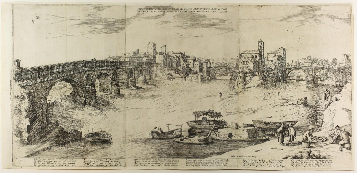 « Voyci le pont Romain, et toutes ses structures, / Le Tybre traversant par ses six curvatures : / Qu’on jadis Palatin, ou du Senat nommoit, / et maintenant le nom de Sant’ Marie recoit.
