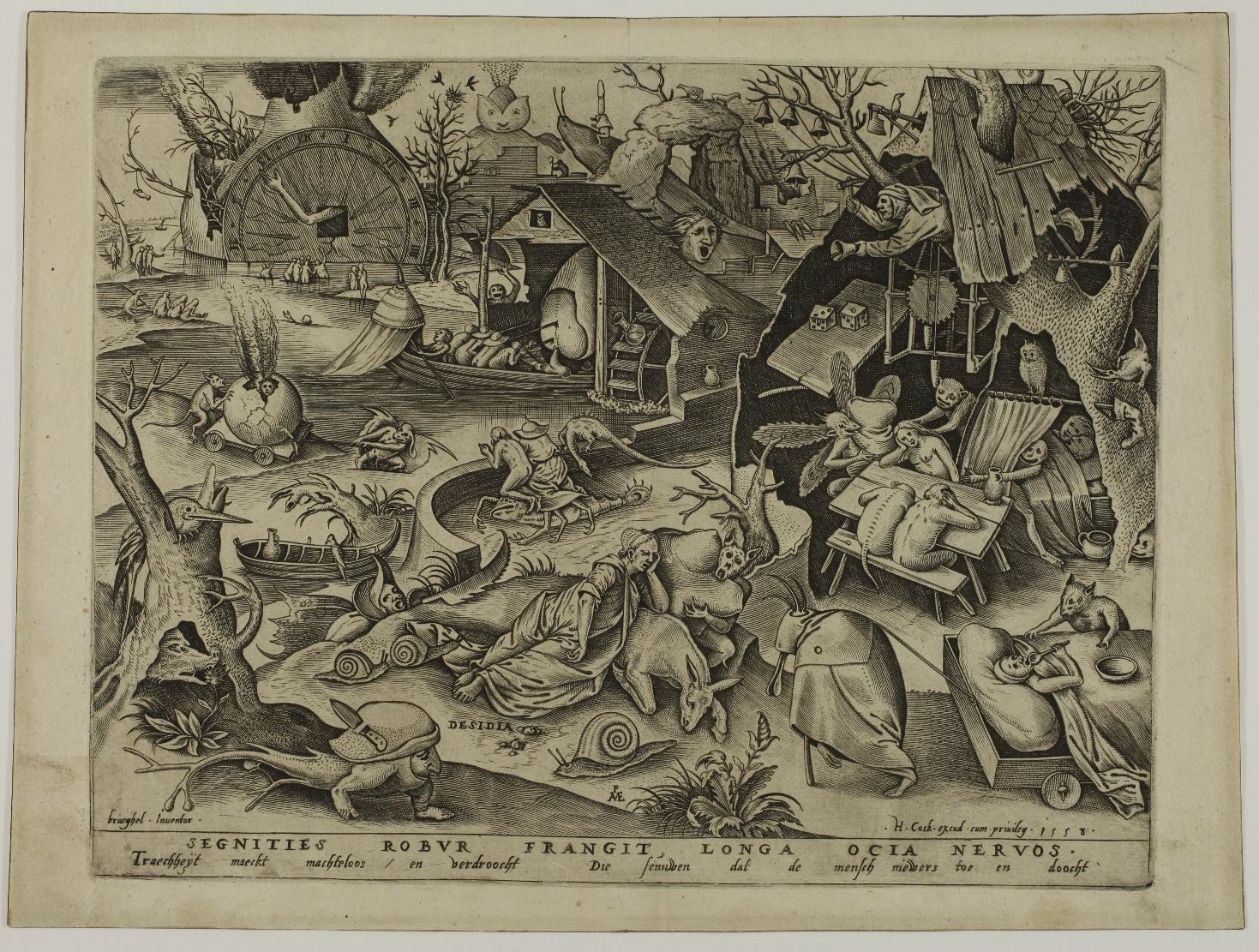 « L’indolence brise la vigueur, l’oisiveté prolongée [brise] l’énergie ». L’orthographe « ocia » est probablement une erreur d’écriture pour « otia ». La légende en moyen néerlandais Traecheyt maeckt machtelos en verdroocht / Die seunuwen dat de mensch nieuwers toe en doocht est traduite ainsi par Maarten Bassens (dans Bruegel, The Complete Graphic Works, 2019, p. 147) :