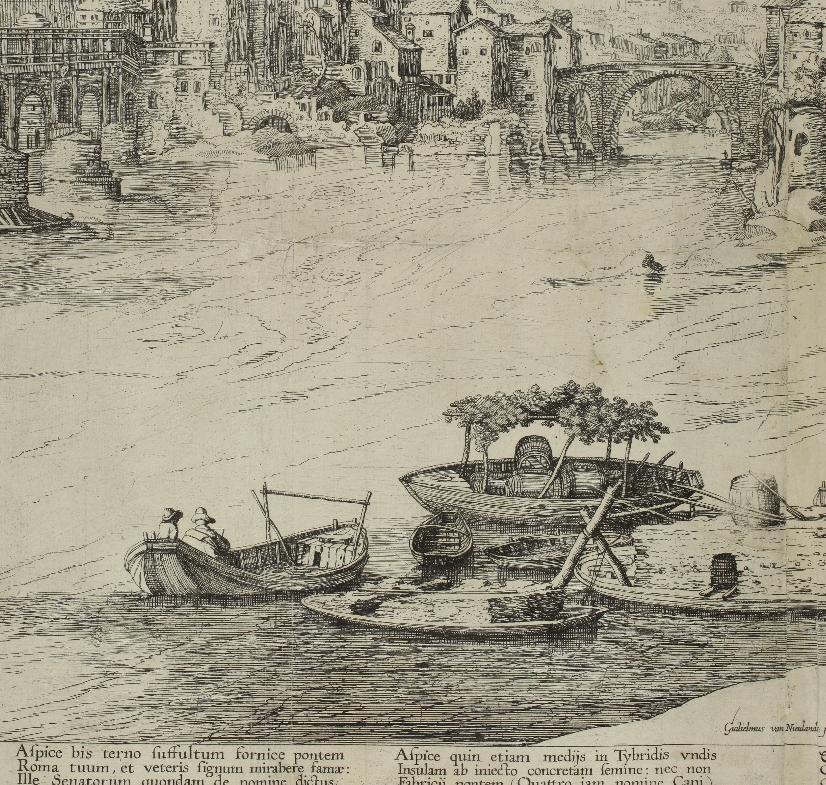 / Et voyci le pourtraict de l’Isle Tiberine / Accreüe peu à peu du fourment de Tarquine : / Contemple außi le pont de Quattro capi dict, / Et de Sainct Bartholmieu, que jadis Ceste fit. »