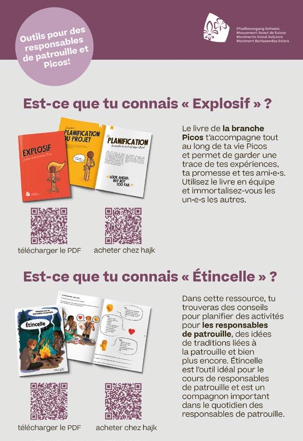 dus des groupes et des camps. Quant aux responsables, ils·elles découvriront au centre du magazine, un résumé des supports pratiques et didactiques qui pourraient leur être utiles pour leurs activités d’équipe et pour les cours. Une double page à détacher et à conserver précieusement avec les autres documents scouts pour disposer en permanence des informations nécessaires.