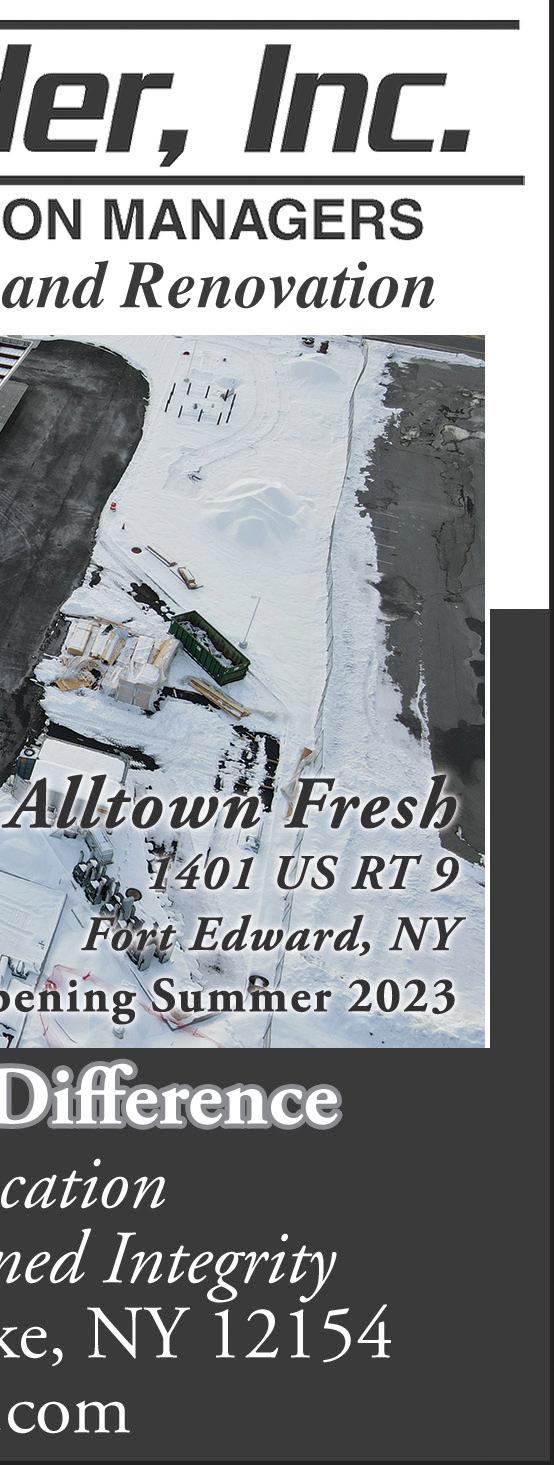 14 • GLENS FALLS BUSINESS JOURNAL • FEBRUARY 2023 w w w l o g j a m r e s t a u r a n t c o m • Lu nch and Di nne r Da ily •Maj or Cr ed it Ca rds •Pri me R ib •Fr esh Chic ken & P or k •Li ve Lobs te r •Char -broi le d S te aks & La mb •Fr esh Fis h •Sa lad B ar w it h a ll Lunc h a nd Dinne r Ent re e s Ro utes 9 & 149 I-87 Exit 20, Lake George, NY R e s e r v a t i o n s : (518) 7 9 8 - 1 1 5 5