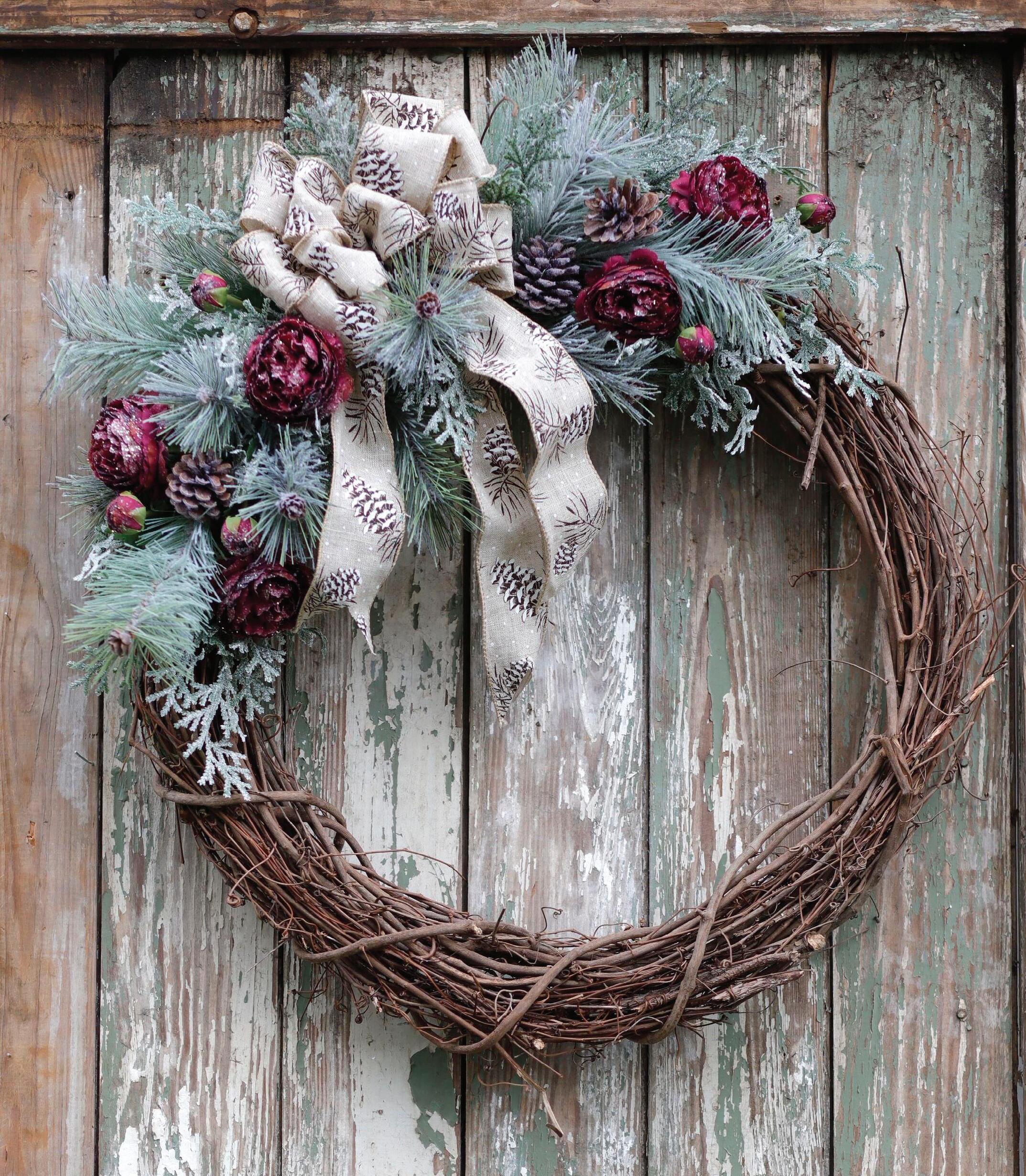 Think outside of the box (or circle) by decking your door with a fun grapevine star. Not a fan of celestial shapes? Try a glittery snowflake!