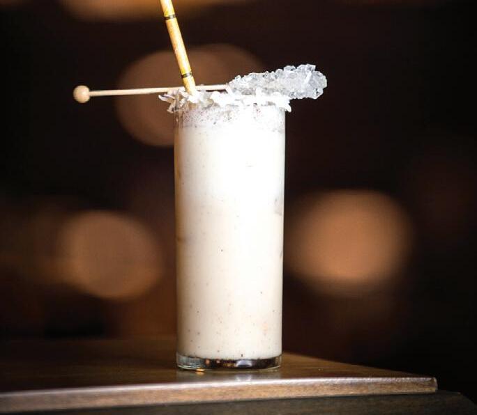 • Rim a Collins glass with simple syrup and flaked coconut.