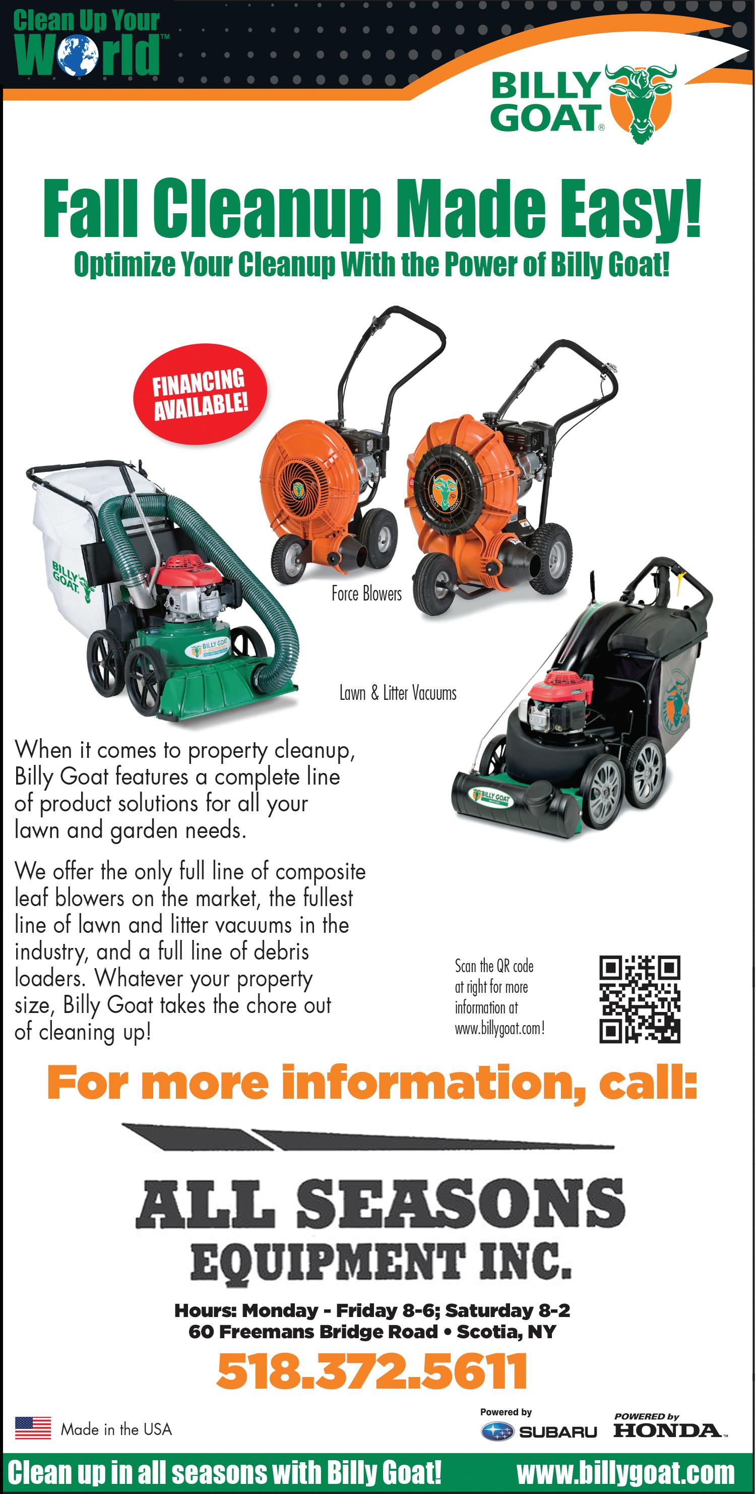 Based in Scotia, the family-owned and -operated All Seasons Equipment, Inc. provides the latest and best in outdoor power products to make your outdoor living more enjoyable. Its friendly and knowledgeable staff will help you find the perfect outdoor power equipment, service or parts you’ve been looking for. All Seasons carries many brands, including Ariens, Honda Power Equipment, Scag, STIHL and Toro. Call today—All Seasons is always ready to help!