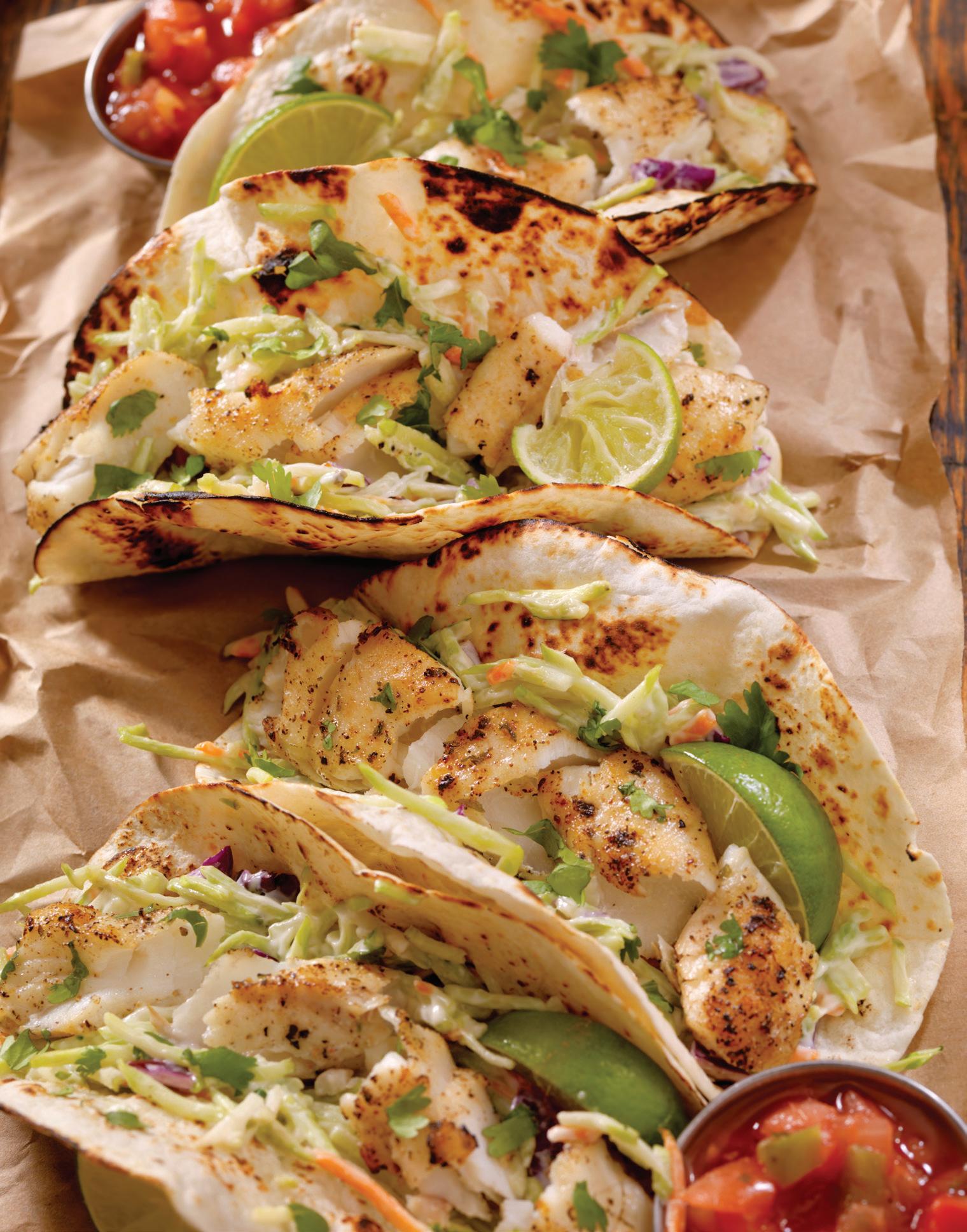 Nutritional Information: Amount per serving (two tacos): Calories 380; Total Fat 6 g; Saturated Fat 1 g; Cholesterol 100 mg; Sodium 220 mg; Carbohydrate 34 g; Fiber 6 g; Total Sugar 6 g; Protein 46 g