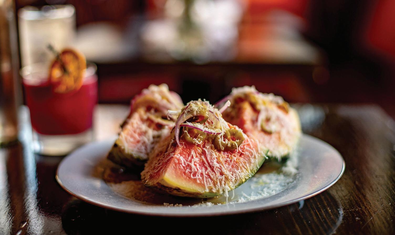 What’s more refreshing on a hot summer day than juicy watermelon? Around our Capital Region, we are blessed with many vari‐eties, each bringing different characteristics to the plate. On the week I visited with the chef and co‐owner of Troy’s Nighthawks, (461 Broadway; nighthawkstroy.com) Josh Coletto, he had just brought in a slew of Little Baby Flower watermelons from the Poughkeepsie Farm Project. The melon is small, about the size of a baby nerf football, its rind a rich ver‐dant green color protecting a sweet interior.