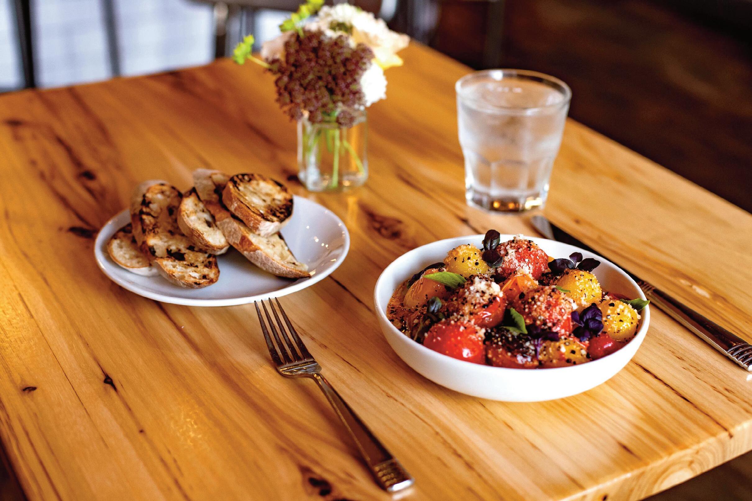 “Our menu uses single titles with descrip‐tors, so this dish is simply ‘Blistered Tomatoes,’” Dillon says. It is an ode to the Catalan dish pan con tomate and an Italian bruschetta. “We keep our menu descriptions pretty basic, so the dish is a surprise when it’s served more complex than how it reads on the