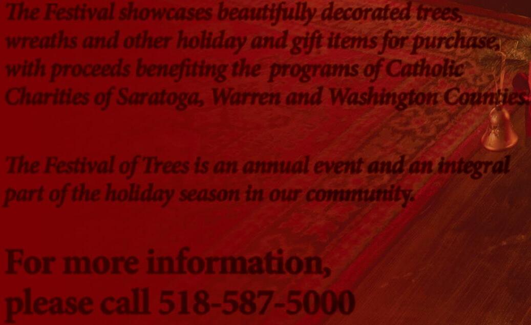 e Festival showcases beautifully decorated trees, wreaths and other holiday and gi items for purchase, with proceeds bene ting the programs of Catholic Charities of Saratoga, Warren and Washington Counties.