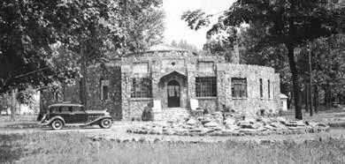 hand hewn from local cut native chinquapin chestnut, now about extinct, and is wainscoted with great stone fossils from the dawn of the earth’s organic life taken from the cryptozoic ledges made famous by Lester’s Park and Ritchie’s Petrified Gardens. When the valve of No. 1 well is turned on, the massive stone bottling house vibrates perceptibly as the deep-seated gas and water emerge through the five-inch rock bore and the piped pressure is often above 150 pounds per square inch. The greatest care is needed in seating the artificial hydraulic seals as on two occasions literally tons of pipe have been projected hundreds of feet into the air.”