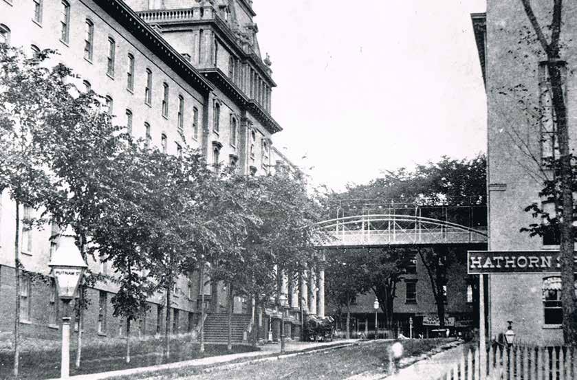 The Congress Hall was located on Broadway between Spring Street and East Congress Street. Congress Hall was built on a relatively small piece of land and did not have a ballroom in the hotel. In order to compete with the other large hotels and their ballrooms, the Congress Hall owner bought land across Spring Street and built a wonderful ballroom. This bridge was constructed across Spring Street to allow hotel guests to easily travel to the ballroom.