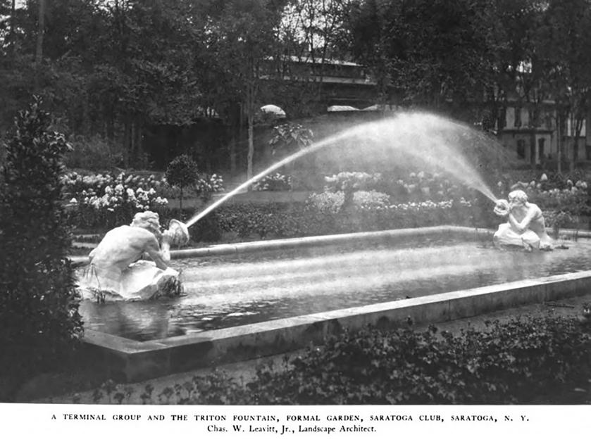 A view from the 1903 ARCHITECTURE (magazine), displaying Mr. Leavitt’s creation for the Saratoga Club of Richard Canfield. The unique sculptures are the work of Louis Potter, and set among a delightful parterre, have charmed visitors to Congress Park for generations.