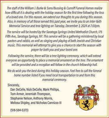 Relatives and friends may call from 2:00 to 4:00 p.m. on Sunday, December 1, at William J. Burke & Sons/ Bussing & Cunniff Funeral Homes, 628 North Broadway, Saratoga Springs, NY 12866, 518-584-5373.