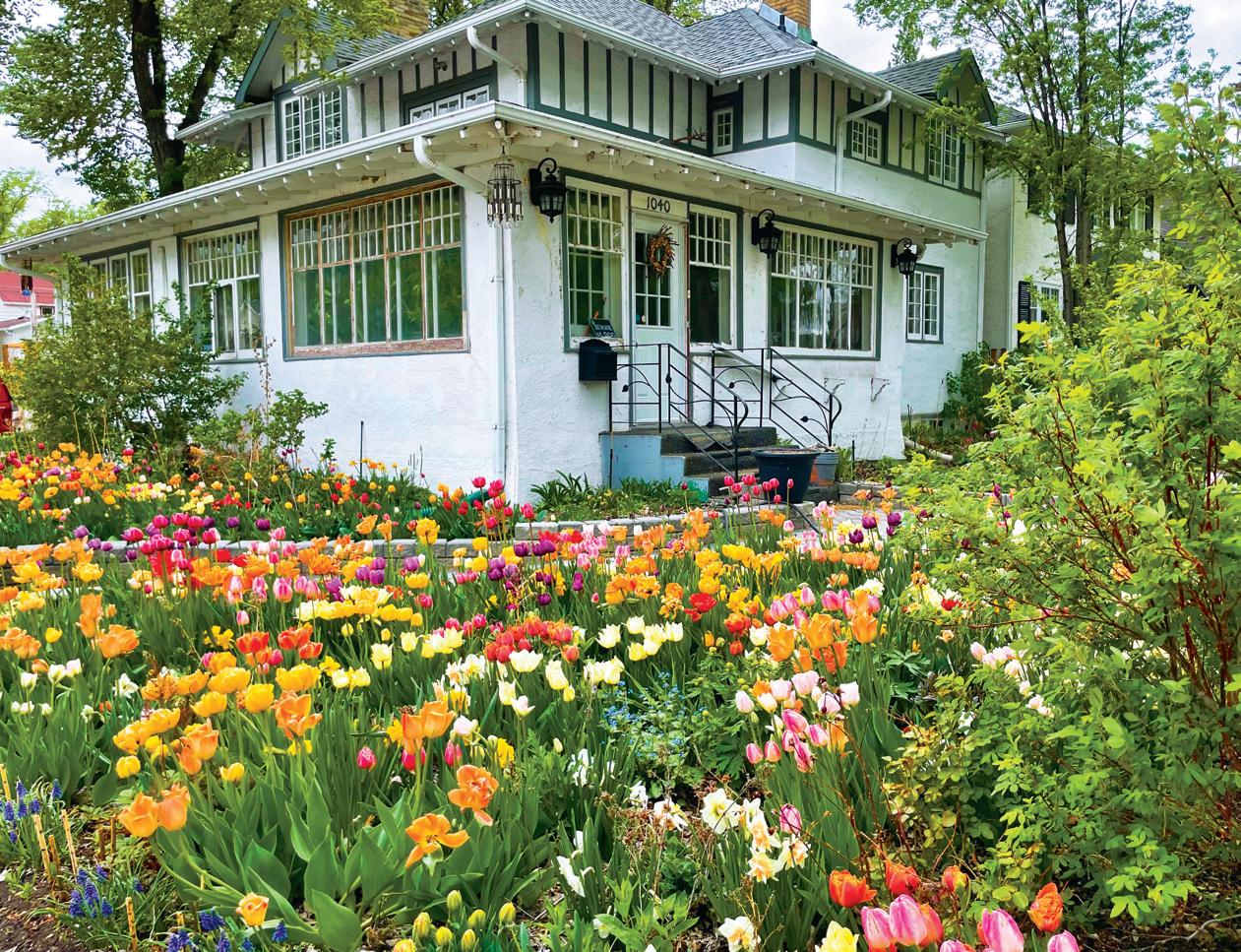 nearby hospital stop for a bright pick-me-up. Besides passers-by who stop with enthusiastic compliments, there are thank you notes in the mailbox. One admirer gave Michael and Clinton a needlepoint of the Mann House festooned with tulips.