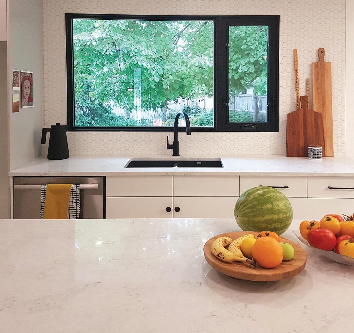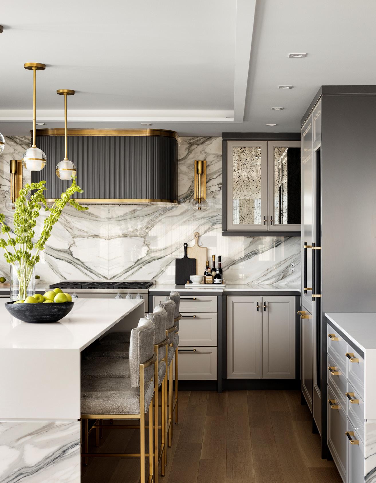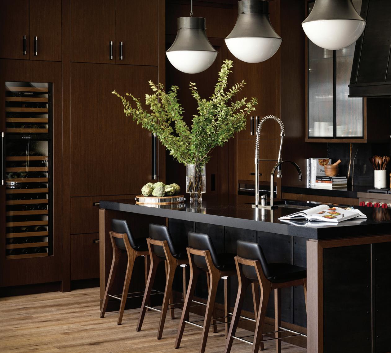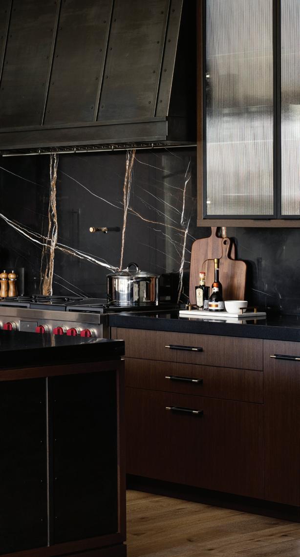 White accents provide contrast and punctuate the space—from the industrialstyle pendant lights, to the veining detail in the black marble backsplash. “The reeded glass in the cabinet doors also feels light so there is a white component, but it’s not in your face.”