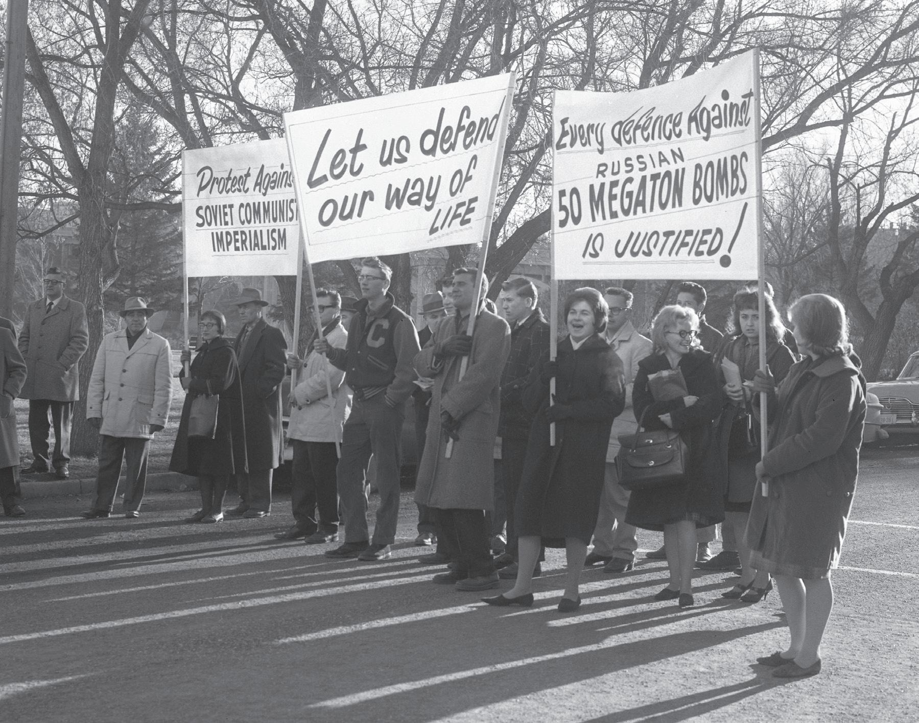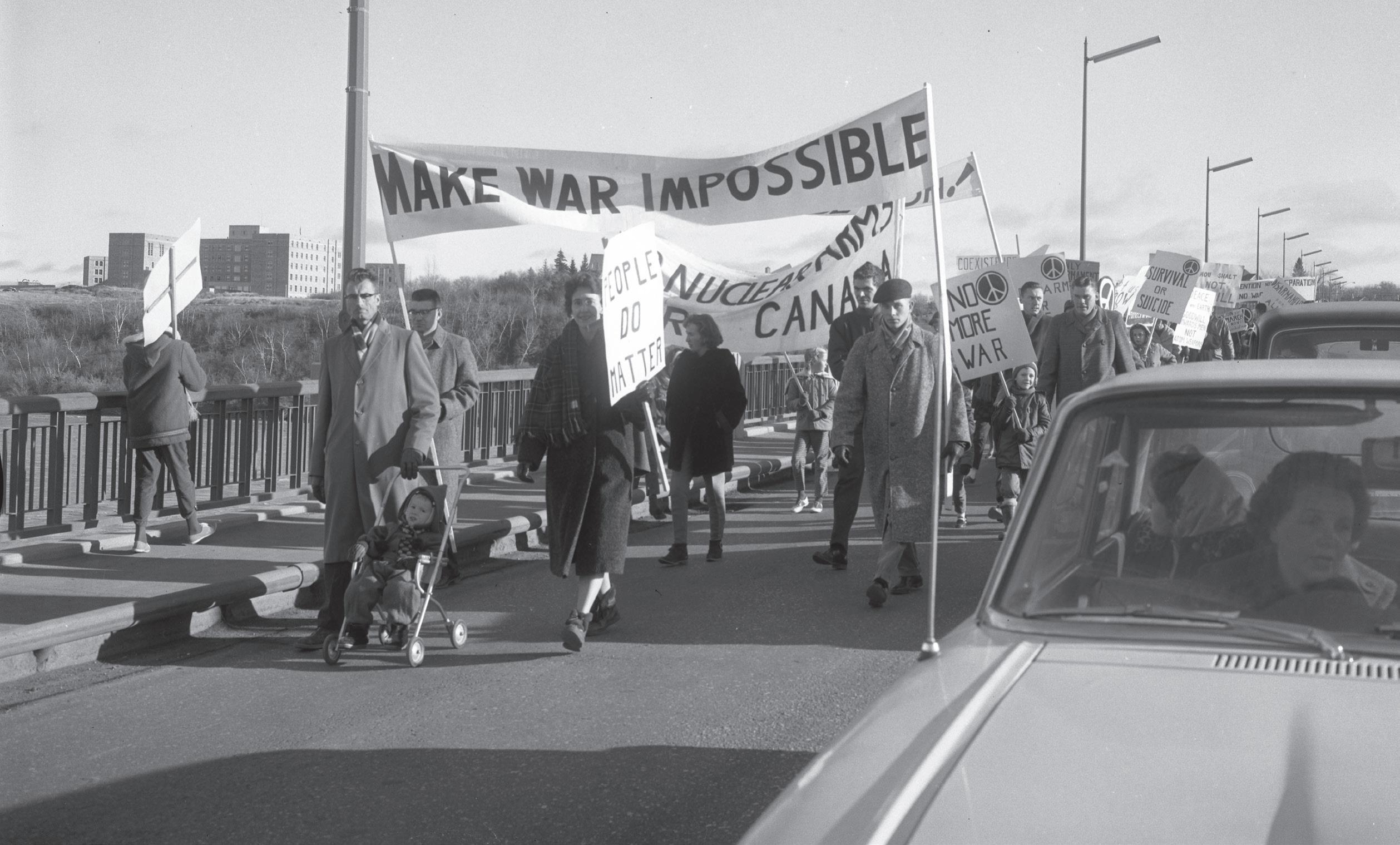 One of the things we remember most about the 1960s are protest marches, inspired by the American war in Vietnam and the Civil Rights Movement. Saskatoon’s first anti-war march was held in 1961, put on by the Congress for Nuclear Disarmament, with a mass march and rally in Kiwanis Park. “Make War Impossible” the signs read. It also attracted counterprotesters calling themselves the “anti-bolshevik bloc.” And this seems to be typical of peace marches here in the 1960s, which attracted not only supporters, but also ridicule and even outright hostility. One march sponsored by a campus group in 1967 had nearly as many hecklers as peaceniks. But it wasn’t just the anti-war folks taking to
