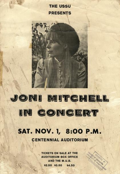 forms in the 1960s, from the “surf rock” stylings of early 1960s, through the British Invasion, psychedelic rock, bubblegum and of course the folk revival, including Saskatoon’s own Joni Mitchell, who played her first paid gig at a coffeehouse on Broadway on October 31, 1962.