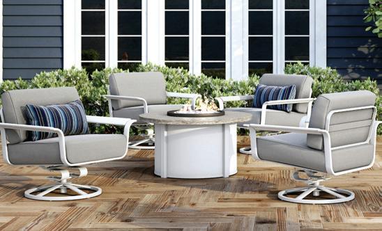 choosing warm wood tones for the new deck and pergola, and selecting comfy, casual low-profile furniture in a neutral palette.