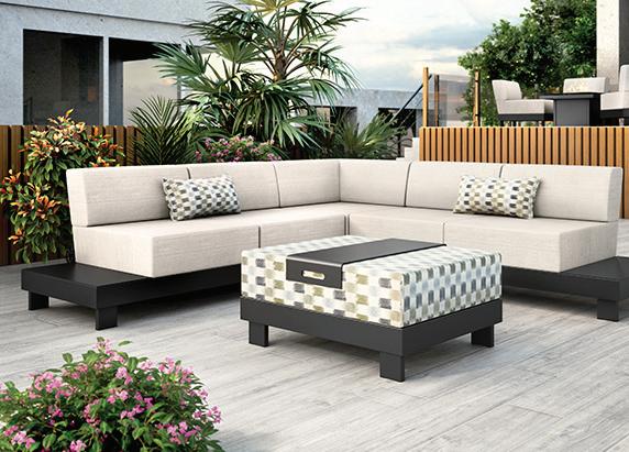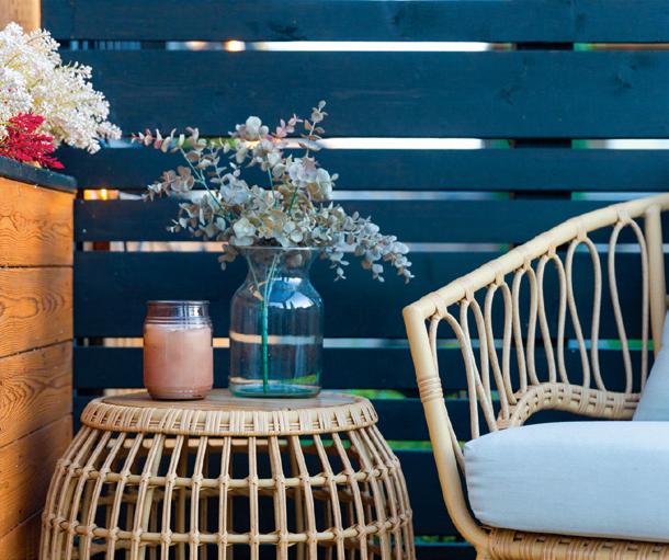 them in half (to 1”x3”), and laying them horizontally, using a spacer between the boards to allow air flow but still provides privacy and shading on hot summer days. Stained black, the screens are a dramatic backdrop against the light-coloured furnishings.