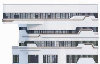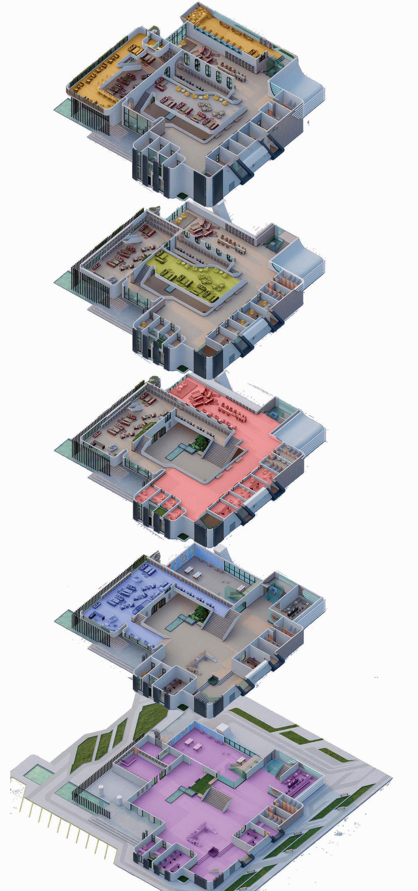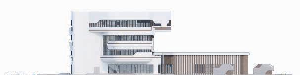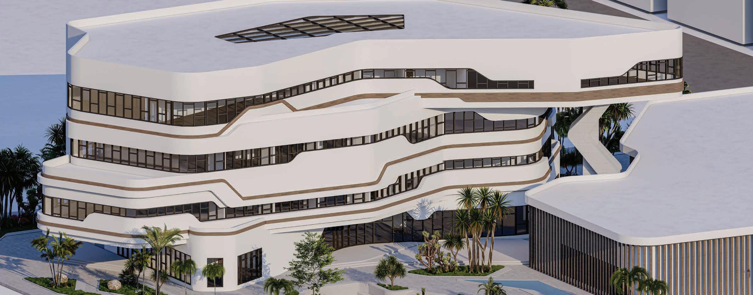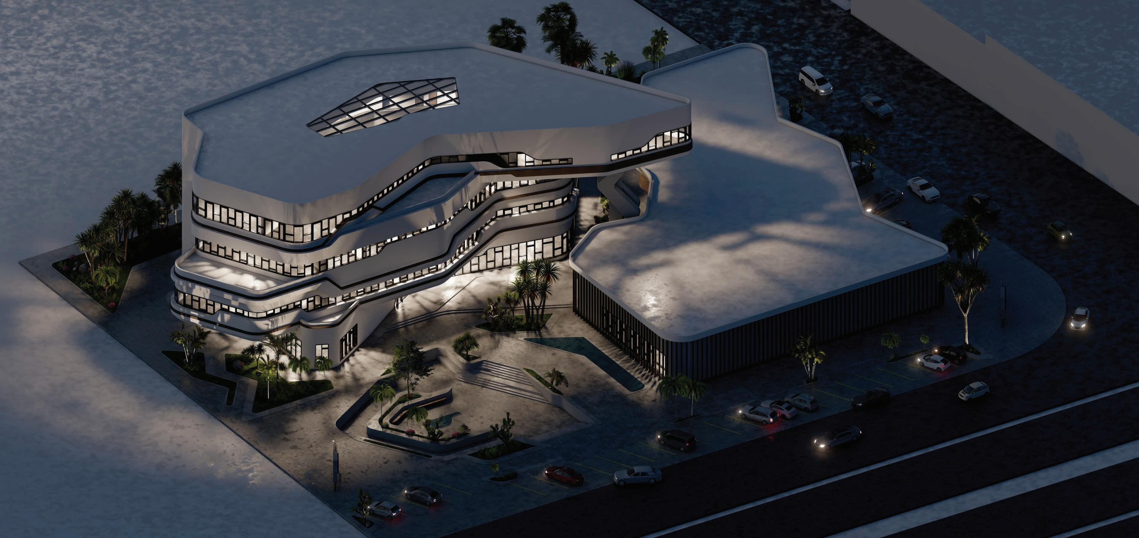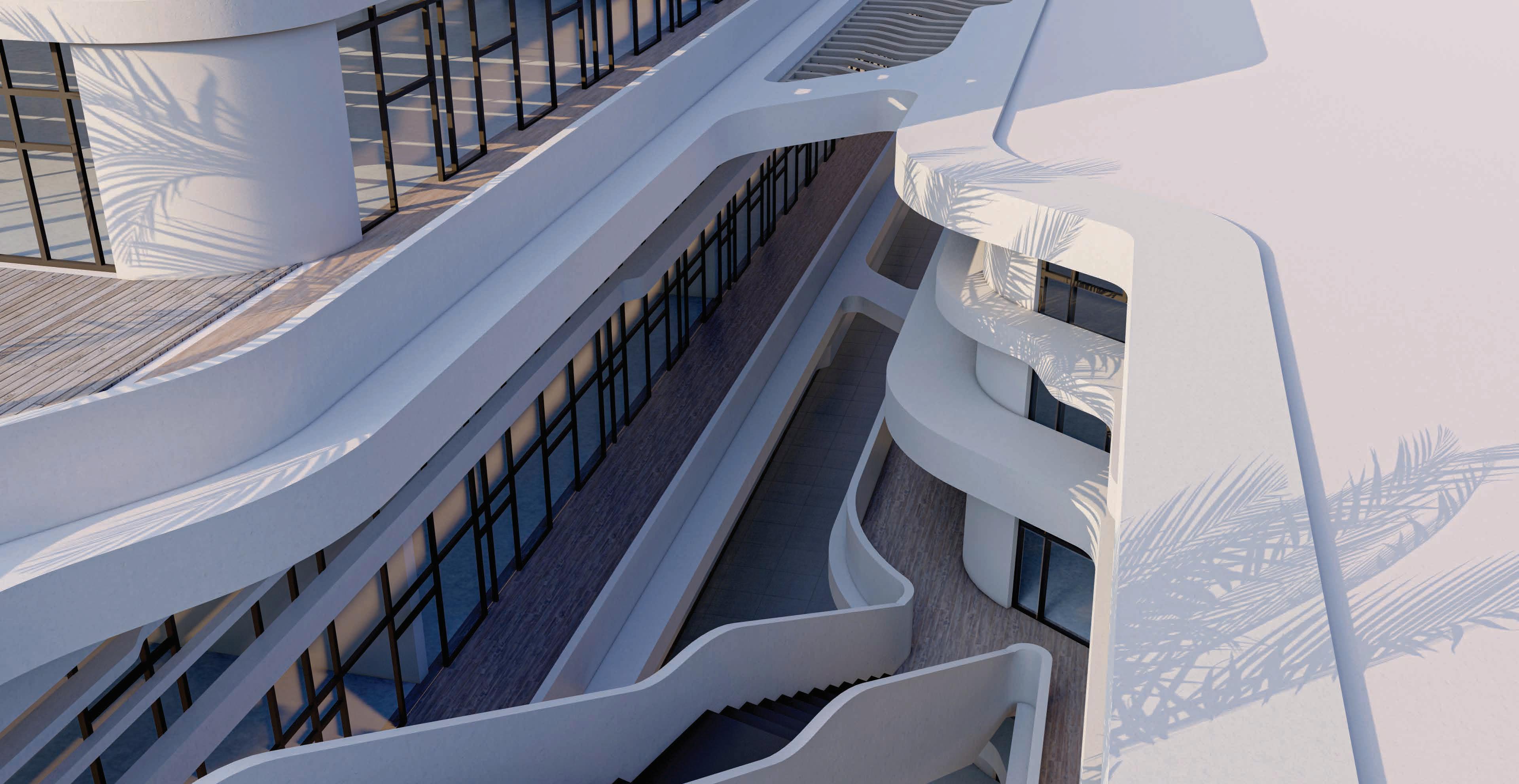BUILDING - A: HAS THE SAME FLUID DYNAMIC WITH THE MAIN CONCEPT WHERE IT SHARES A CONNECTION WITH THE WALLS AND THE LANDSCAPE, IT ALSO CONNECTS THE INNER ENVIRONMENT WITH THE EXTERIOR ENVIRONMENT AND SHADES THE INTERIOR WITH LARG SHADING DEVICES THAT GO ALONG THE ELEVATIONS AND PROTECTS THE USERS FROM THE SUN RAY.