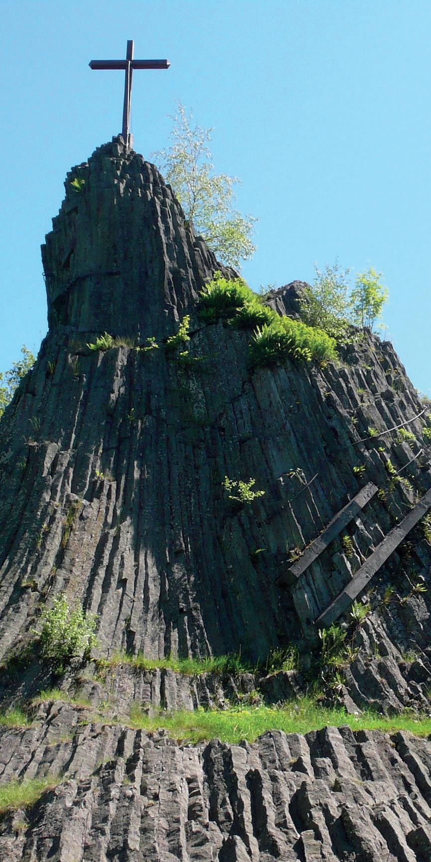 Holzkohle-Hochofenanlage im deutschsprachigen Raum. Durch „Klein-Tirol“ des Wildenburger Landes und den 400 m langen Hohenhainer Tunnel führt der Radweg zum historischen Stadtkern Freudenberg im Siegerland. Abschließend geht es über Niederfischbach mit dem Siegerländer Dom und dem Tierpark nach Kirchen an der Sieg, wo sich die 20 m hohe Basaltformation der Kultstätte Druidenstein im Stadtteil Herkersdorf und der 19 m hohe Ottoturm mit RundumBlick ins Siegtal und zum Westerwald noch für einen Besuch empfehlen.