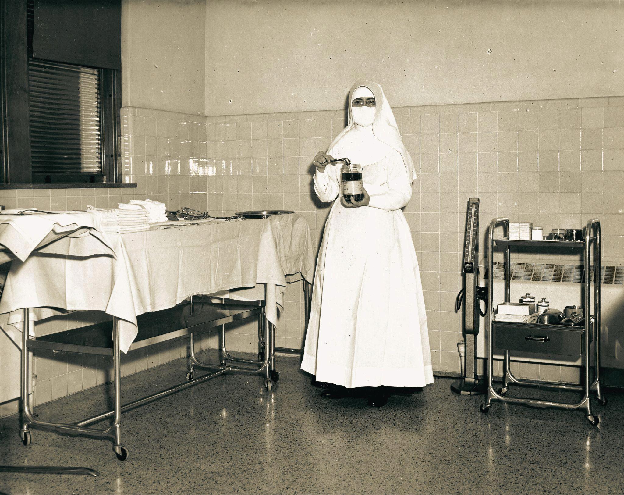 At the center of it all were the sisters. Over 120 sisters served at St. Mary’s Ringling Hospital. They came from all backgrounds with names like McNamara, Hollerbach, O’Toole, Strassmann and Brown. They worked as nurses, dieticians, administrators, X-ray and laboratory technicians, accountants, and laundresses. They worked at all hours of the day and night whenever duty called.