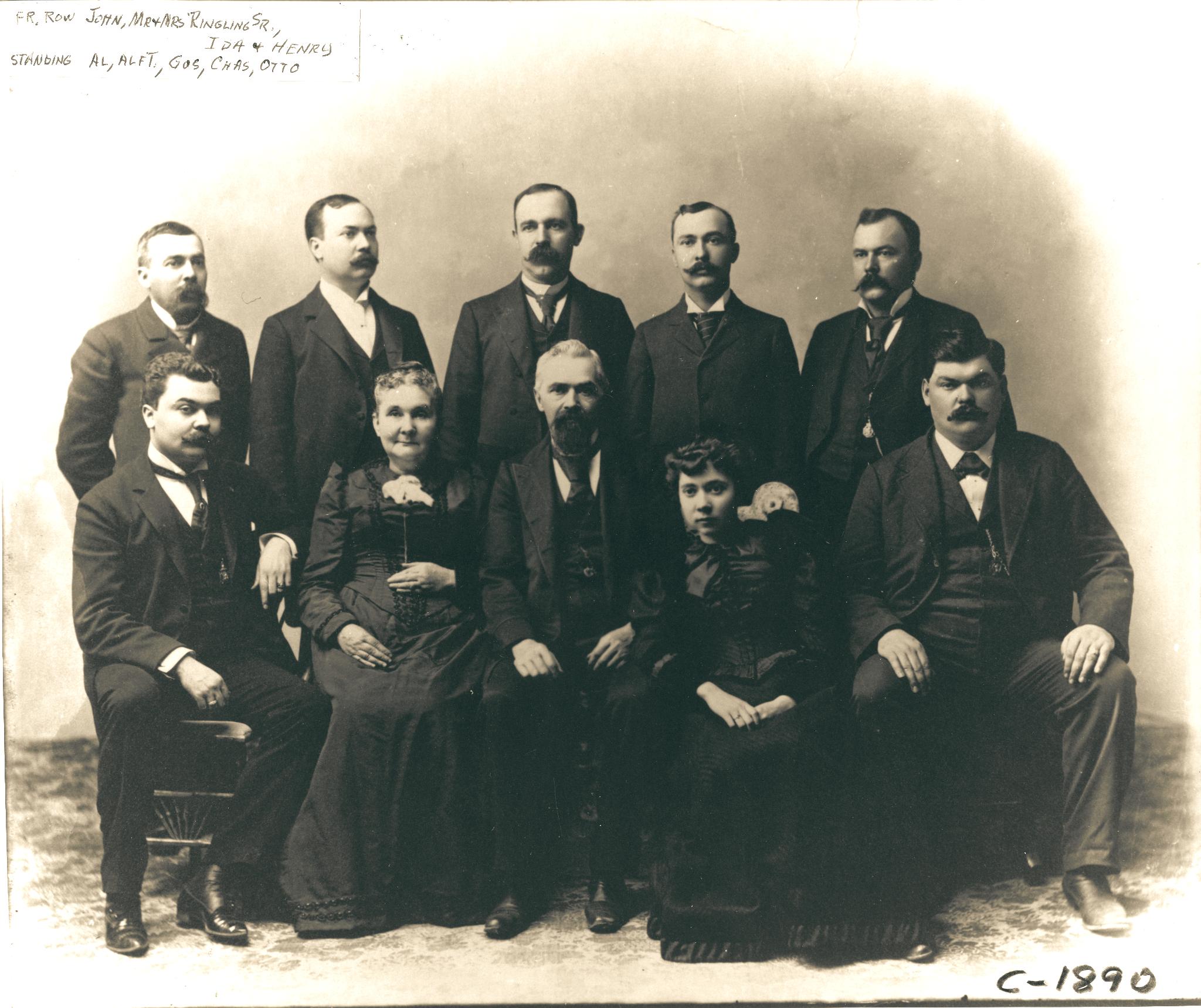 Around 1895 the Ringling family paused for a photograph. It is believed to be the last photograph of the entire family before Father Ringling died in 1898