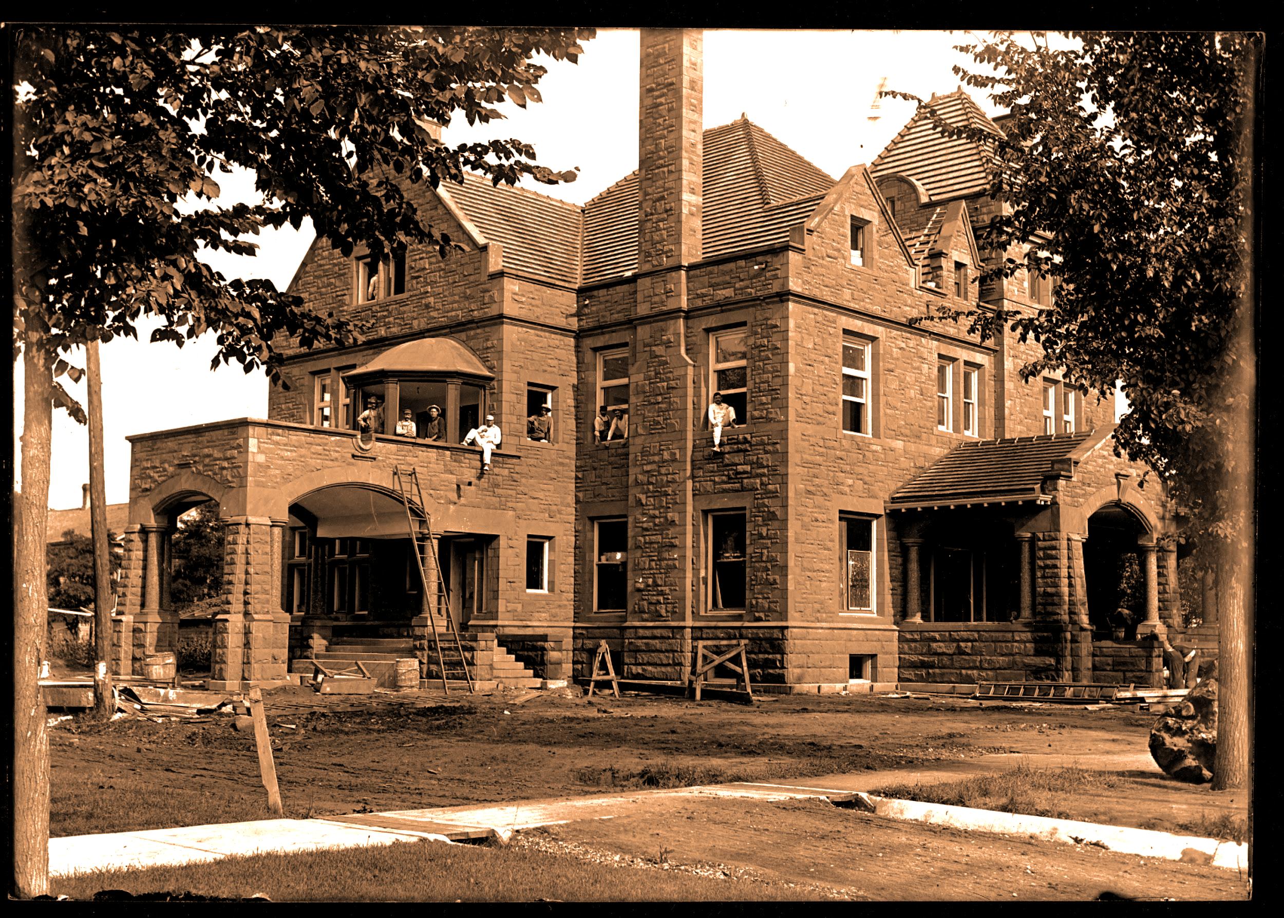 Alf. T. also started building in the summer of 1899. He had purchased two lots at the corner of Oak and Tenth streets. But unlike his older brother he was not going to start out small or modest. He desired a palatial and stylish residence and while the circus was in Minneapolis in July he closed a deal with the leading architect of the city, Fred Kees. Architect Kees was instructed to design a luxurious home "at once." The "at once" must have been heeded as ground was broken at the corner of Oak and Tenth streets only three weeks later. The plan called for a unique house based loosely in the Neoclassical style borrowing elements from Georgian, English and Italian style vocabularies. Although built of wood the house was nonetheless spacious being about 40 by 65 feet with rooms for entertaining and even a pipe organ. The interiors were lavishly decorated with mahogany trim work in many rooms. Bathrooms were outfitted with costly decorative tiles. The house took several months to complete and set back Alf. T. Ringling the princely sum of $6,500.