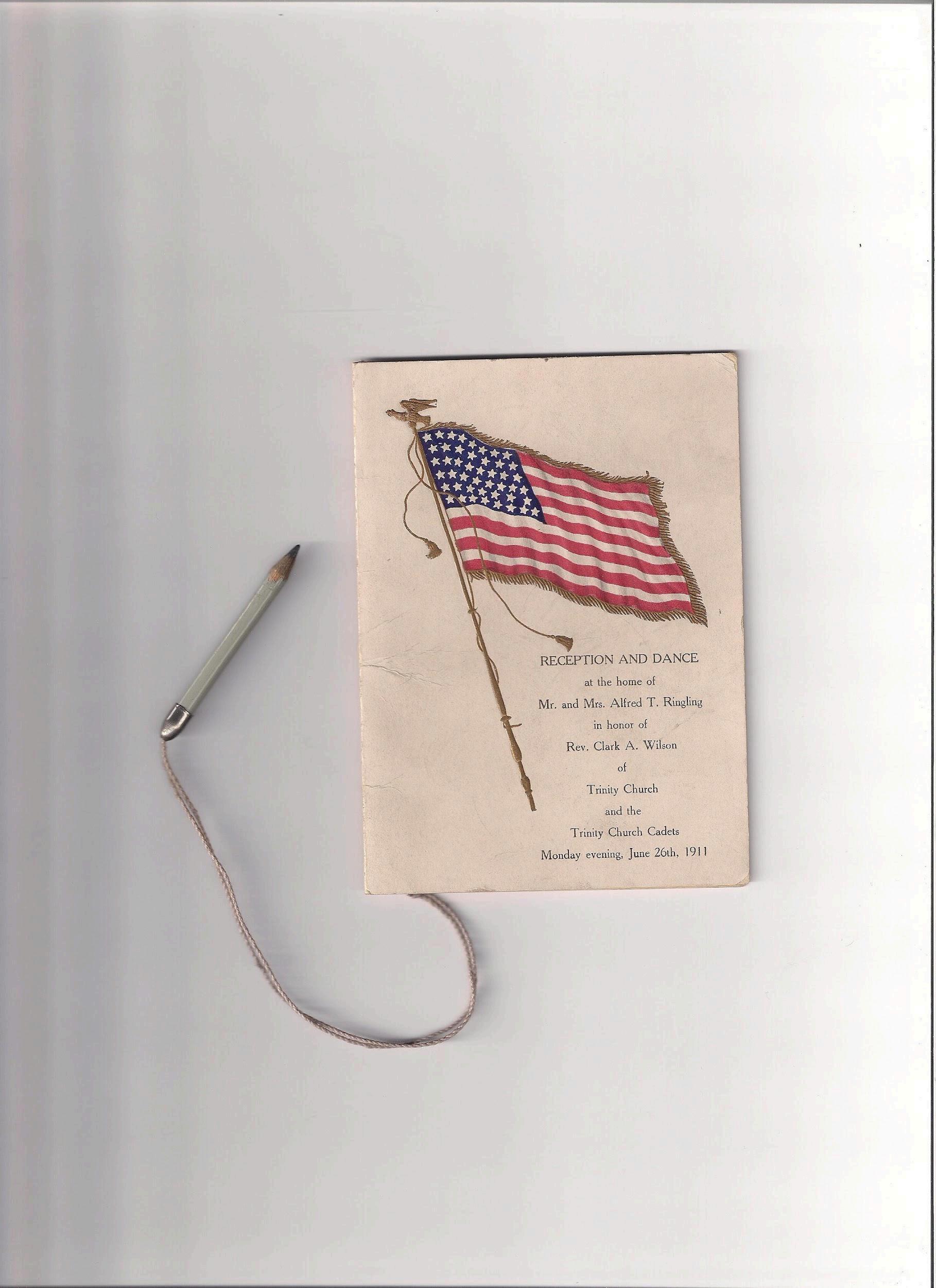 Back outside, in the center of it all, Della greeted her guests and handed out small dance programs. Each was embossed with an American flag in full color with gilt highlights. A small pencil was attached to each so that guests could fill out their dance cards.