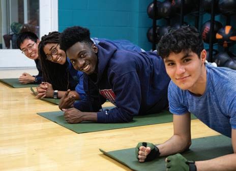 8: Sophomore nursing major Diego Gonzalez (front) and juniors Logan Famutimi, psychology major; Aunya Anderson, biology major; and Joseph Park, health science major, hold plank positions during an exercise class at Hulsey Wellness Center.