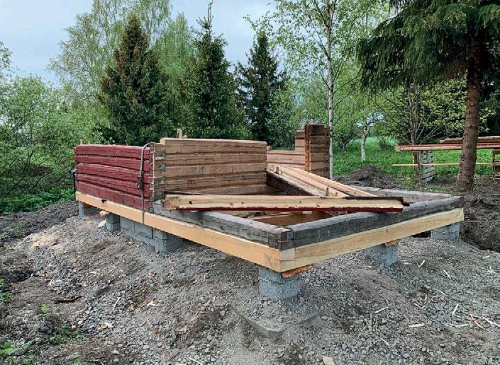 Mutta niin vain saunan perustukset olivat valmiit toukokuun loppupuolella. Ensimmäisenä valetun anturan märkään betoniin kirjoitettiin oksanpätkällä isäntien nimet ja päivämäärä 9.5.2021.