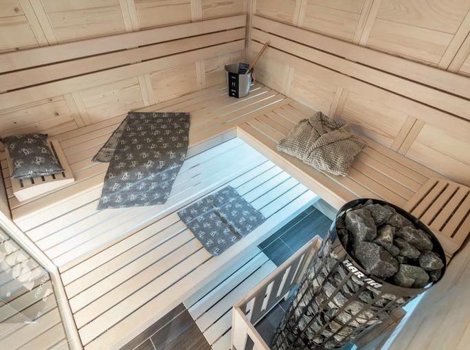 • A SZAUNA TARTOZÉKA MÉG EGY KÉTRÉSZES LÁBRÁCS ILLETVE KÁLYHAVÉDŐ (SZAUNA KÁLYHA OPCIONÁLISAN KÉRHETŐ, JAVASOLT KÁLYHA TELJESÍTMÉNY: 9KW)